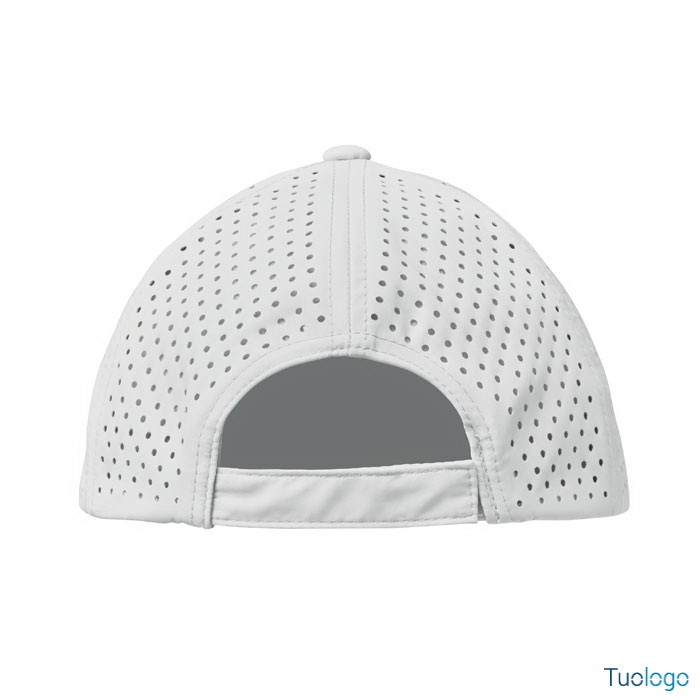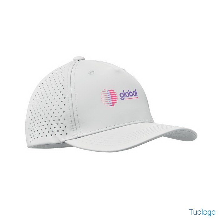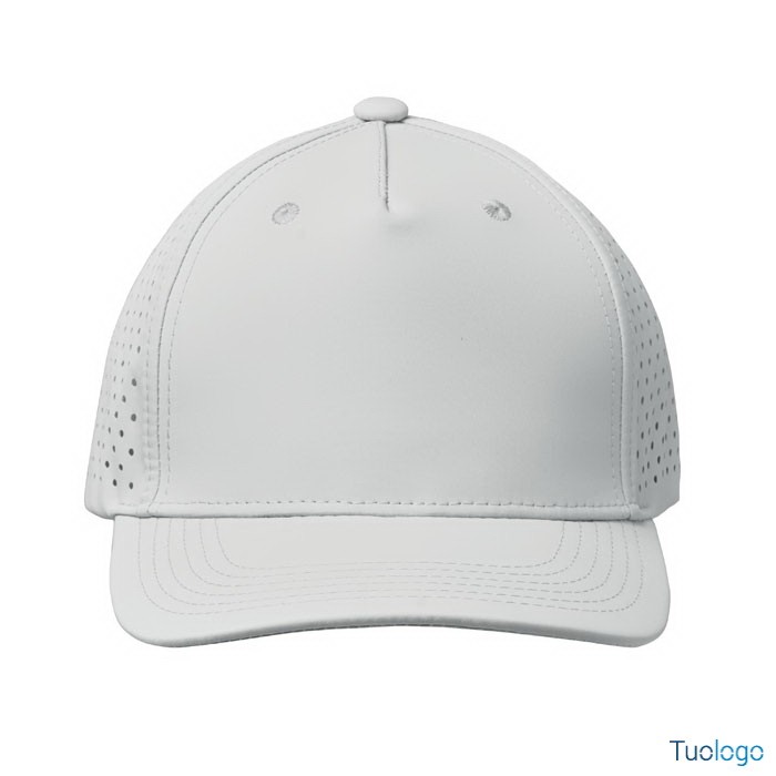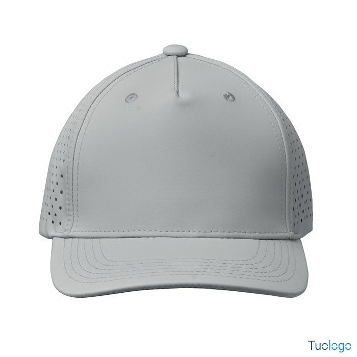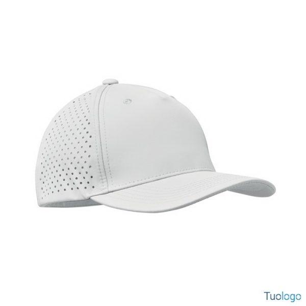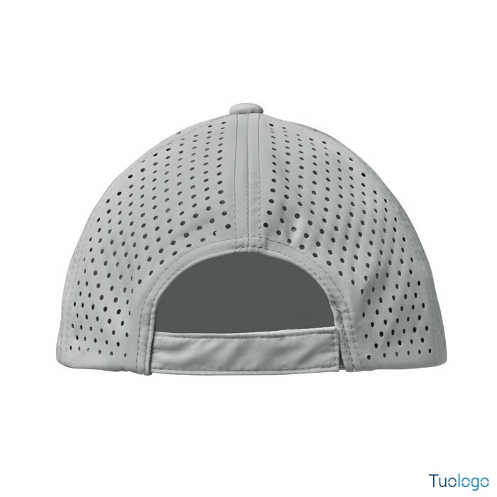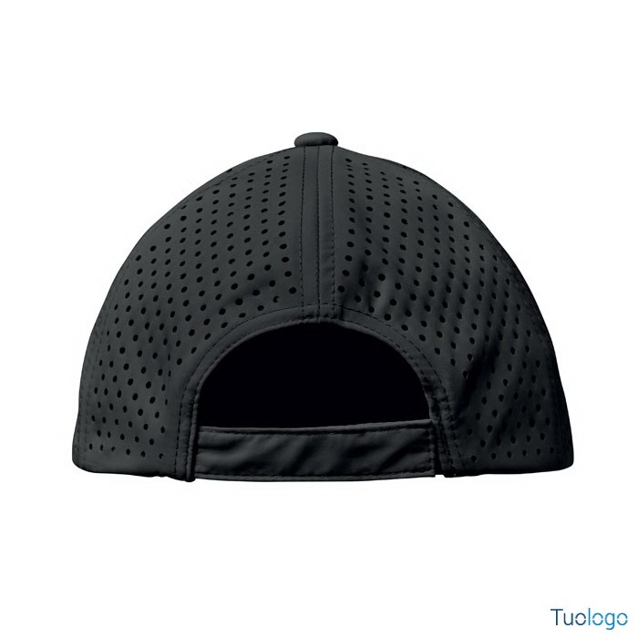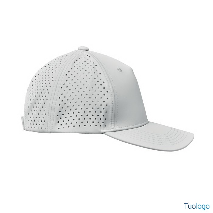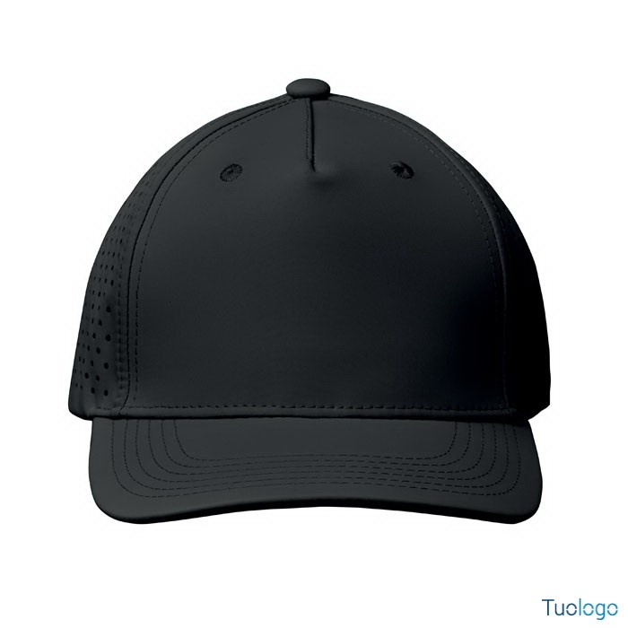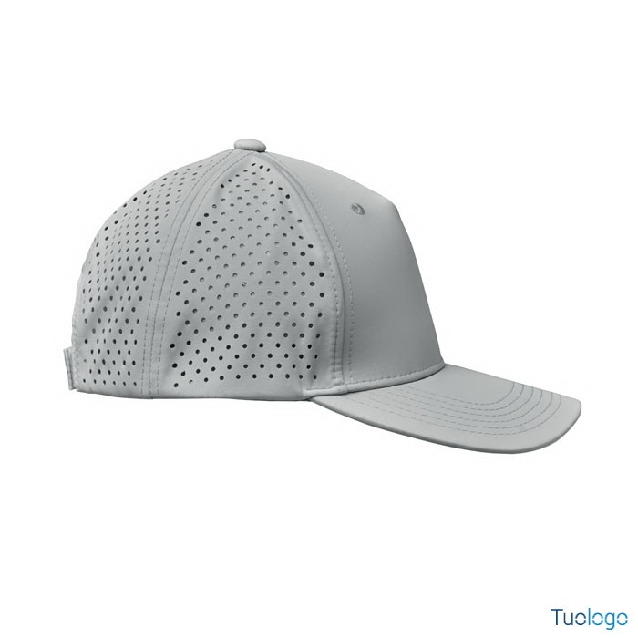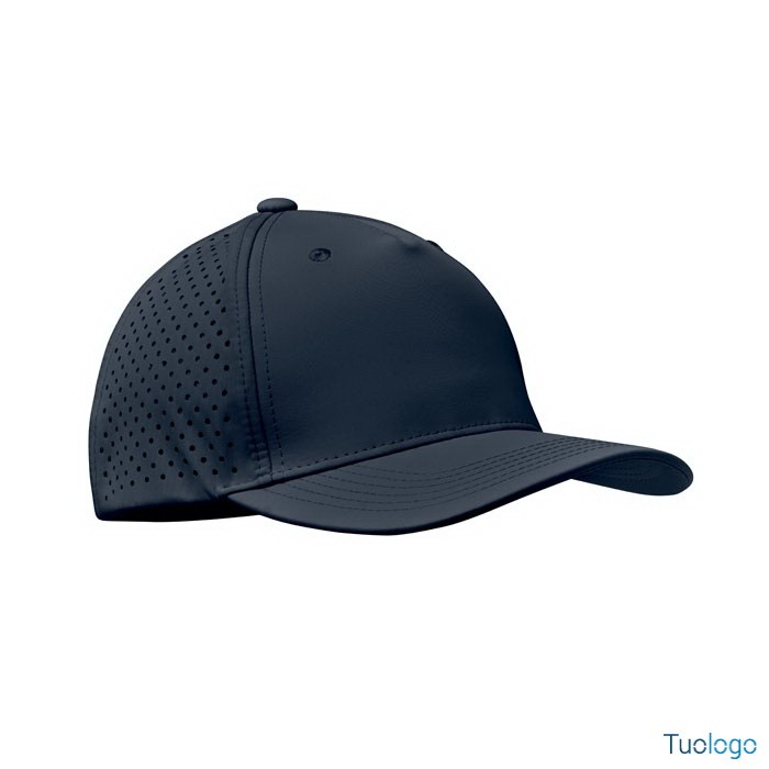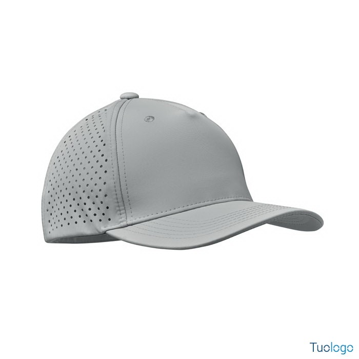 Cappellino a 5 pannelli in poliestere Murillo. Cappellino a 5 pannelli in poliestere ad alte prestazioni con chiusura a gancio e anello regolabile e fori perforati al laser. Asciugatura rapida, repellente al sudore. Dimensioni:cm 21x16x11.
