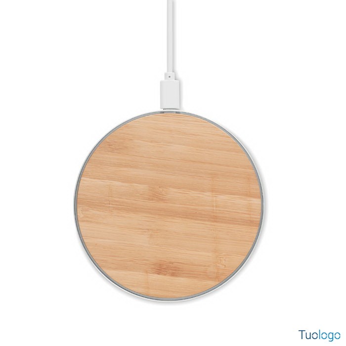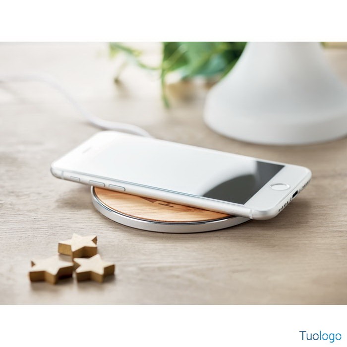 Caricabatterie wireless in bamboo Deda. Caricabatterie wireless in bamboo e alluminio. La luce blu resta accesa durante la ricarica. Uscita: DC9V/1.1A.Dimensioni: cm diam 9,9x0,8.