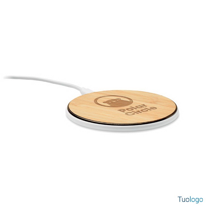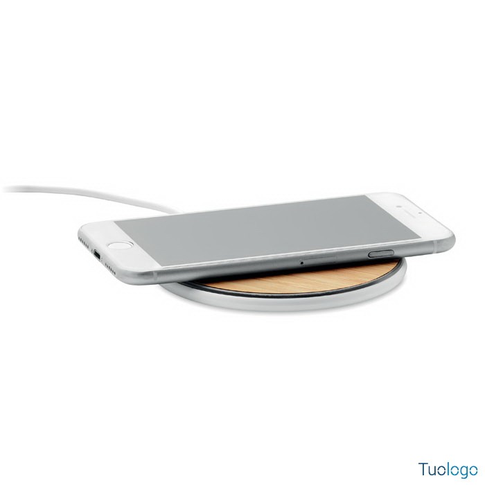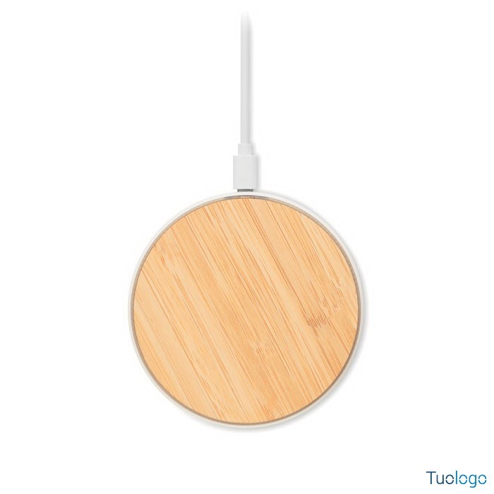 Caricatore wireless 10W Ranello. In bamboo e ABS, 10W, ricerca rapida. Posizionare il cellulare sopra lo stand per avviare la carica. Dimensioni: diam cm 10x0,7. Uscita: DC 9V/1.10A (10W) . Compatibile con tutti gli smartphone che supportano la ricarica wireless.