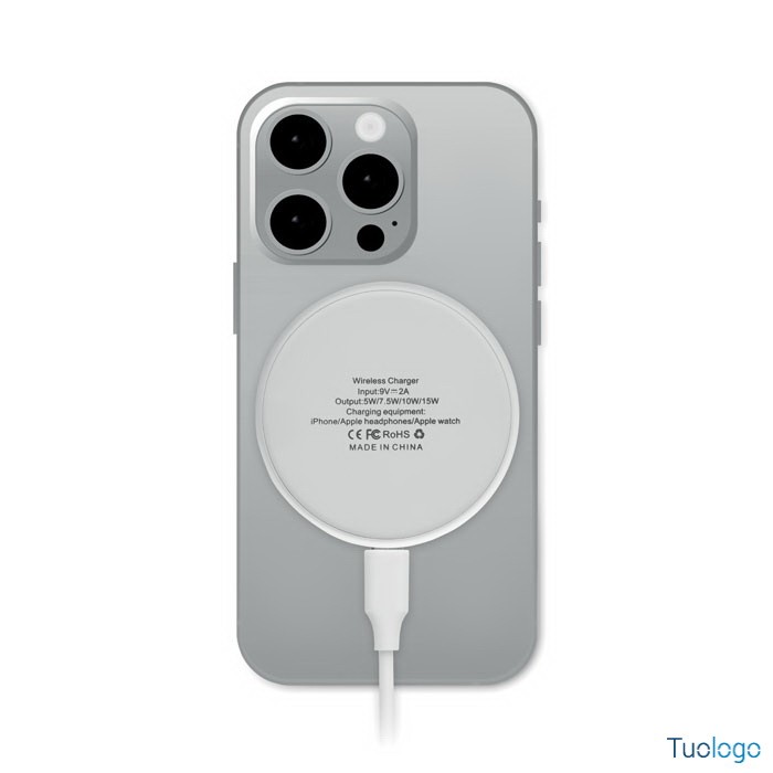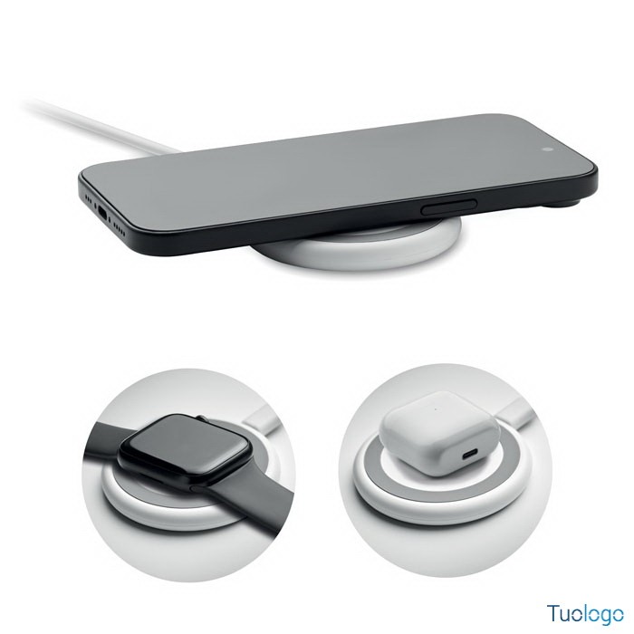 Caricatore wireless 3 in 1 Puesto. Caricatore wireless magnetico da 15W, caricatore per smartwatch solo Apple e caricatore TWS. Lunghezza del cavo: 1m. Ingresso: 2-in-1 Tipo-C e Tipo-A. Dimensioni: diam cm 6,5x0,8.