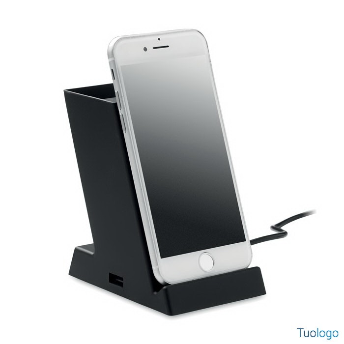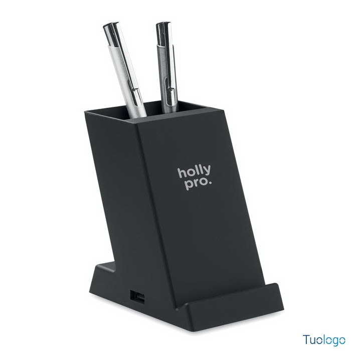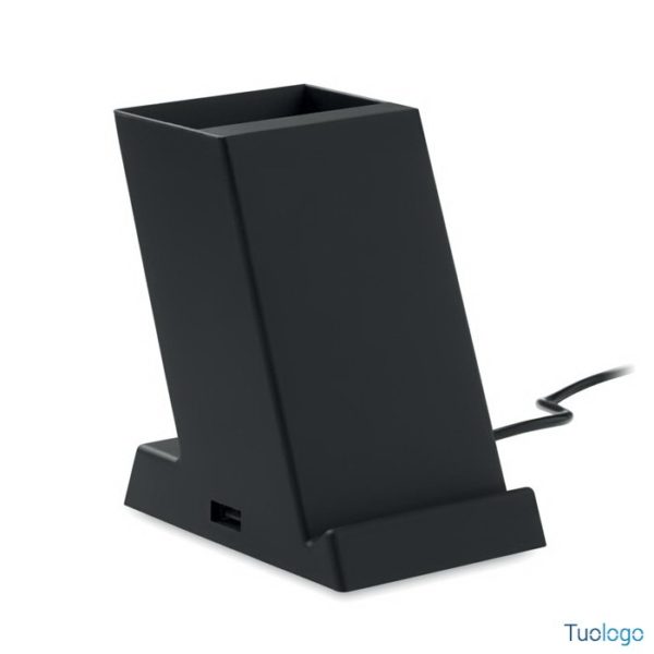 Caricatore wireless in ABS Agnita. Caricatore wireless a doppia bobina da 15W con portapenne in ABS. Uscita: DC 9V/1.67A. 1 uscita di potenza della porta USB-A. Adatto ad Android, iPhone® 8, X... Dimensioni: cm 6,6x9,8x10,7. Mantenete la scrivania organizzata e lo smartphone carico allo stesso tempo con questo portapenne dall'aspetto moderno. Basta posizionare il dispositivo mobile sul portapenne e inizierà a caricarsi.