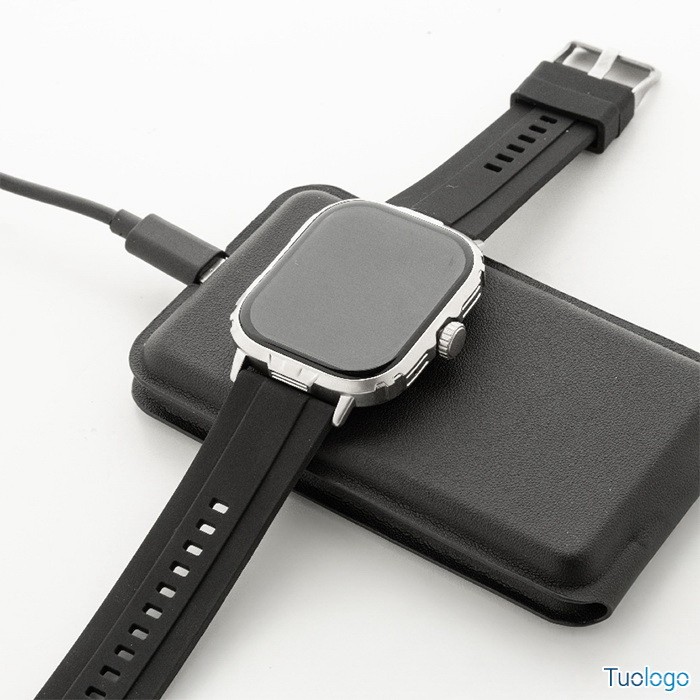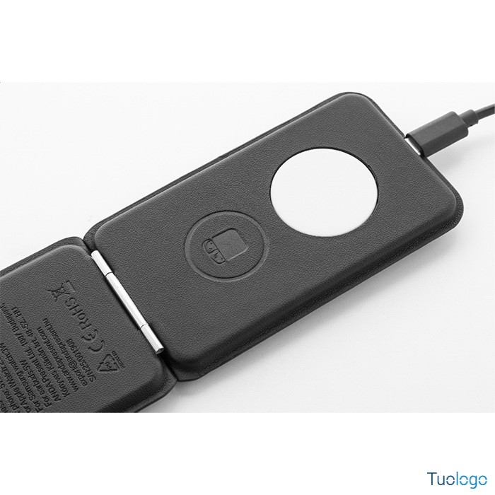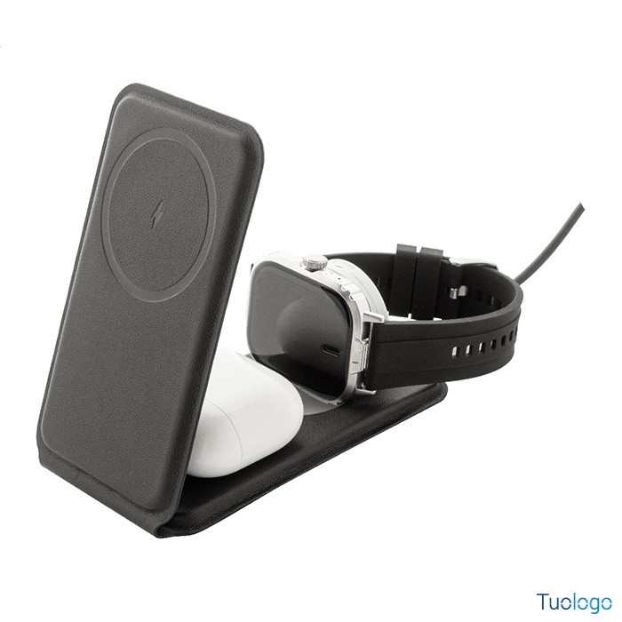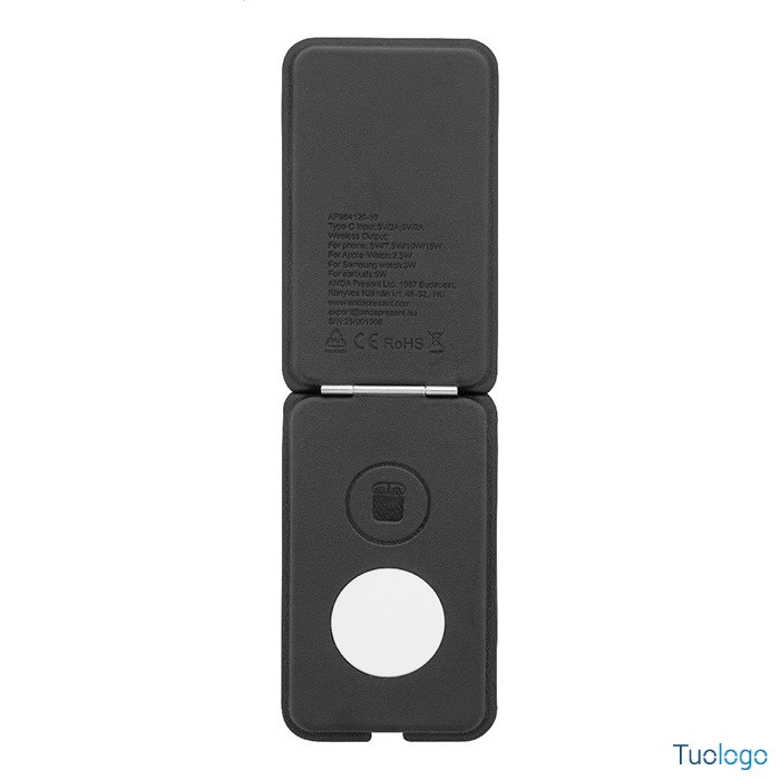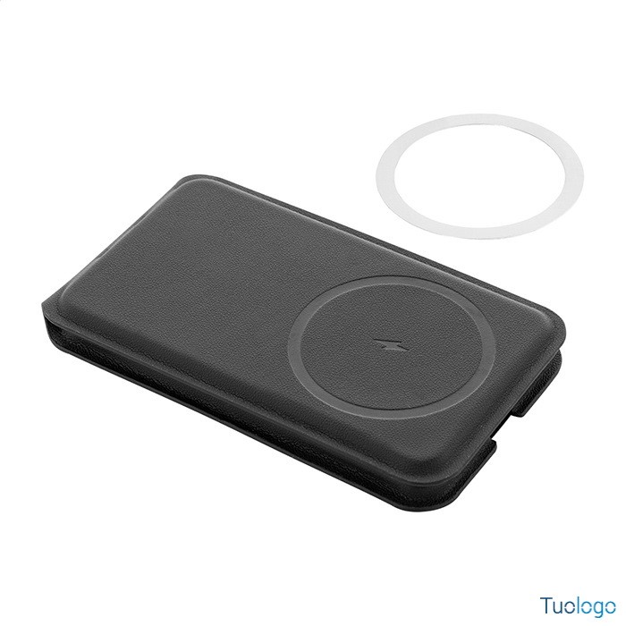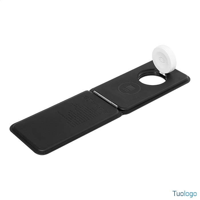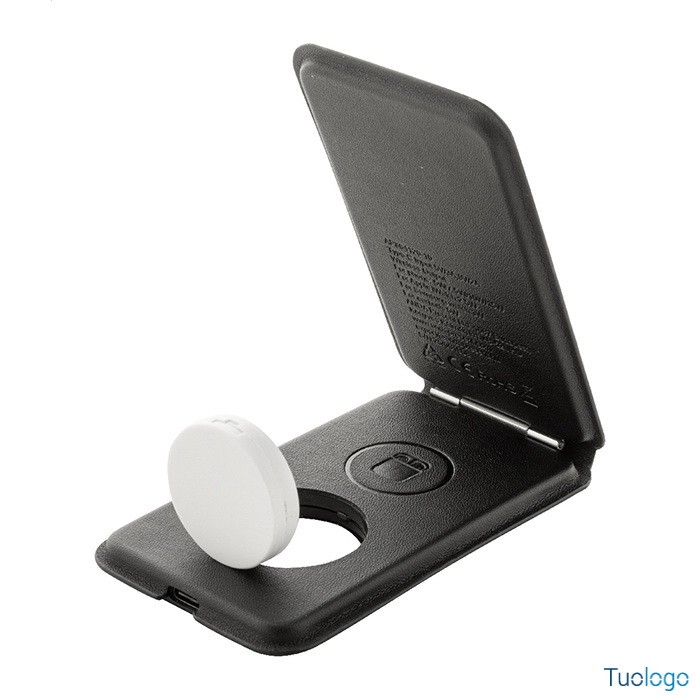 Caricatore wireless Klemtu. Elegante portacellulare pieghevole e set di caricabatterie wireless in pelle PU riciclata. Cavo di ricarica USB incluso. Dimensioni: cm 6,5x11,5x1,8.
