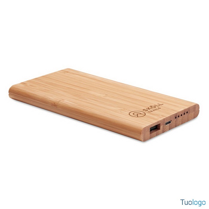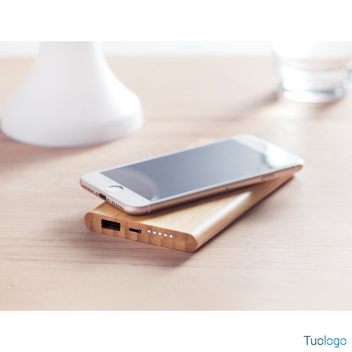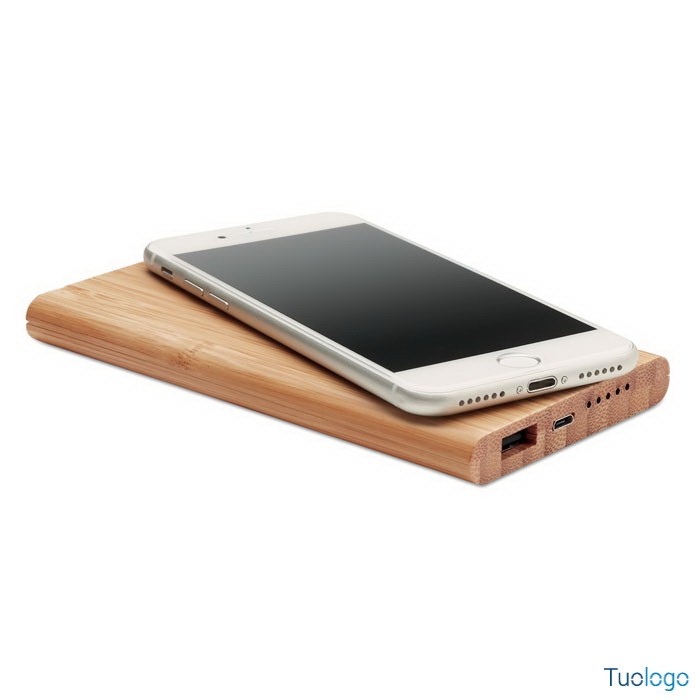 Caricatore wireless powerbank Sirolo. Caricatore wireless e powerbank con capacità di 6000 mAh in Bamboo. Include il connettore di tipo C. Output powerbank DC5V/2A. Output wireless: DC5V/1A. Dimensioni: cm 14,5x7,5x1,6. Compatibile con tutti gli smartphone che supportano la ricarica wireless. In bamboo naturale, possono verificarsi variazioni di colore tra i vari articoli.