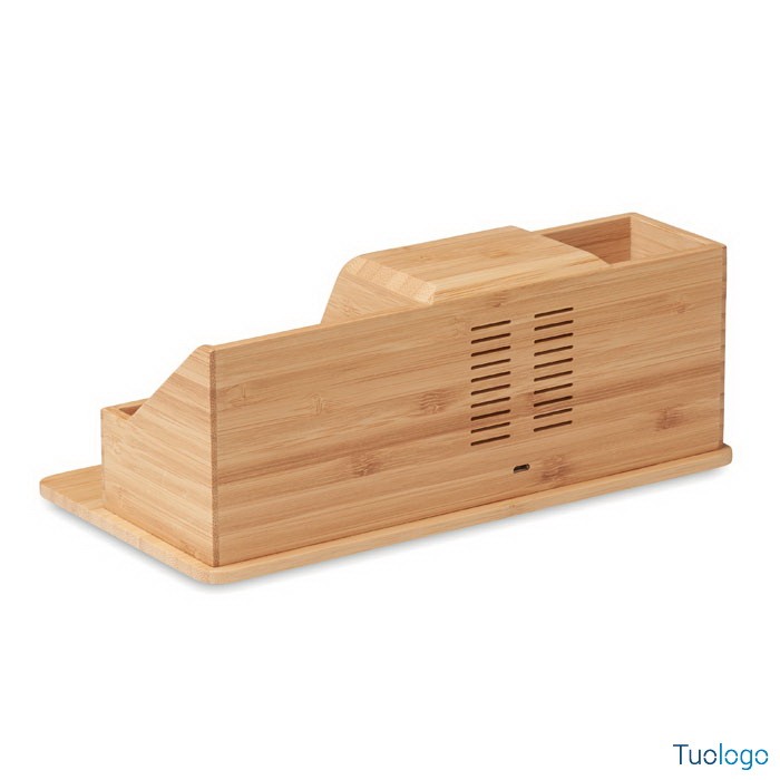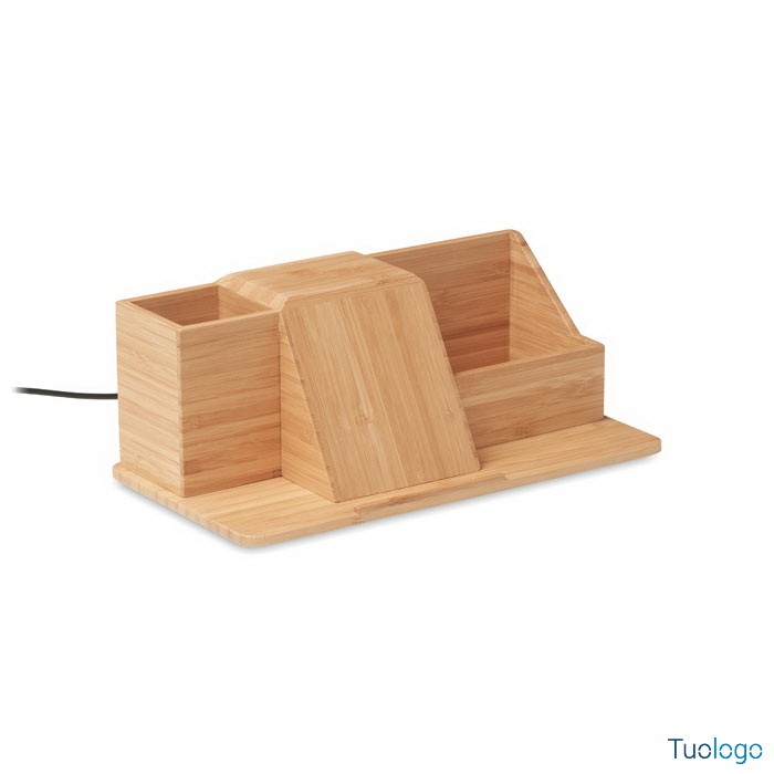 Caricatore wireless Scardilli. Organizer da scrivania e portapenne in bamboo, supporto per telefono, caricatore wireless. Output: DC9V/1.1A (10W). Dimensioni: cm 24,5x12,9x9,2. Collegare il dispositivo al computer e appoggiare lo smartphone per avviare la carica. Compatibile con tutti gli smartphone che supportano la ricarica wireless.