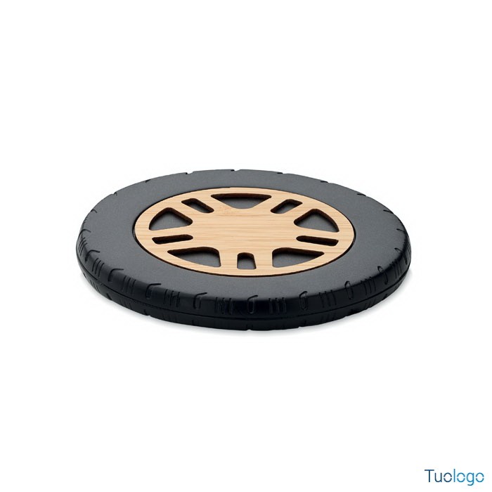 Caricatore wireless Terrain. Caricatore wireless 15W in ABS riciclato con top in bamboo a forma di pneumatico. Uscita: DC 9V1.10A 15W per una ricarica rapida. Compatibile con gli ultimi Android, iPhone. Dimen: diam cm 9x1. Compatibile con tutti gli smartphone che supportano la ricarica wireless.