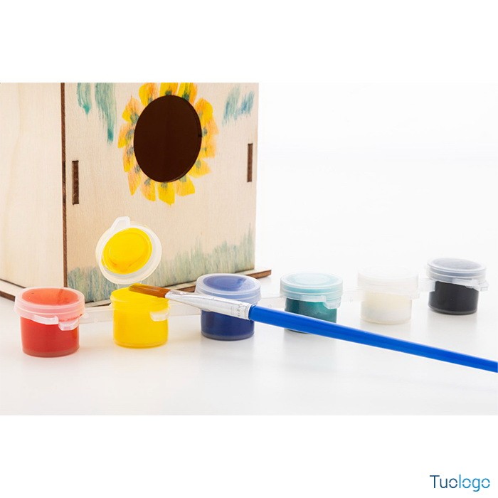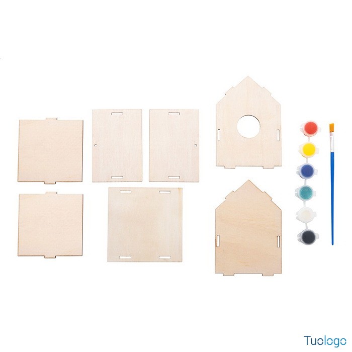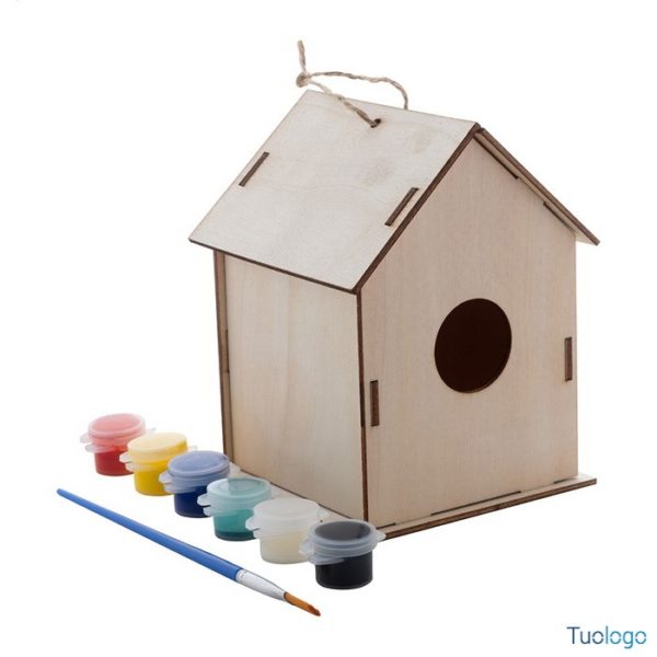 Casetta in legno per uccelli Bena. Casetta fai-da-te in legno per uccelli completa di kit per decorazione ad acquerello (pennello e 6 colori). Fornita in confezione piatta. Dimensioni: diam cm 9,9×9,7×13.