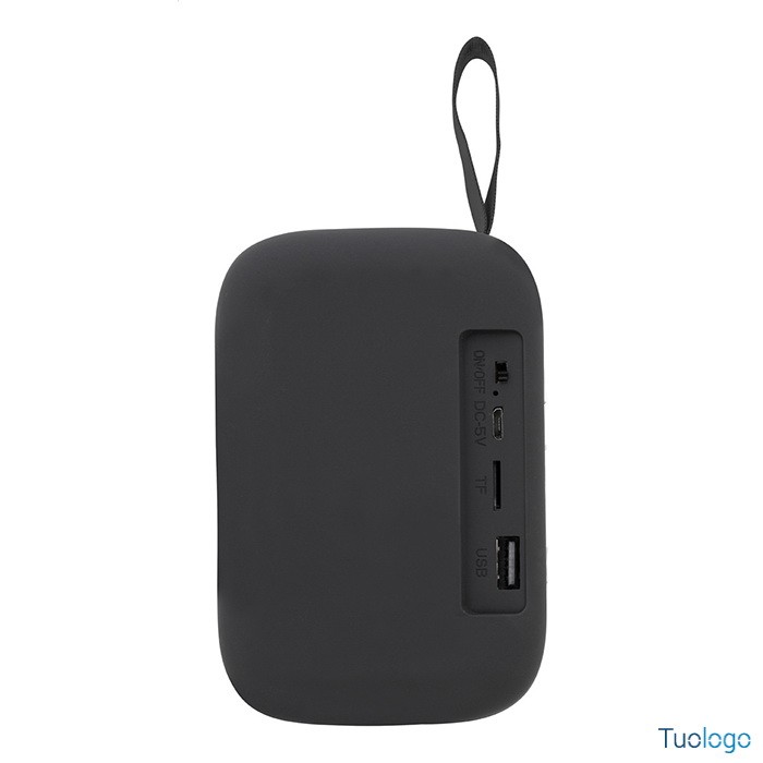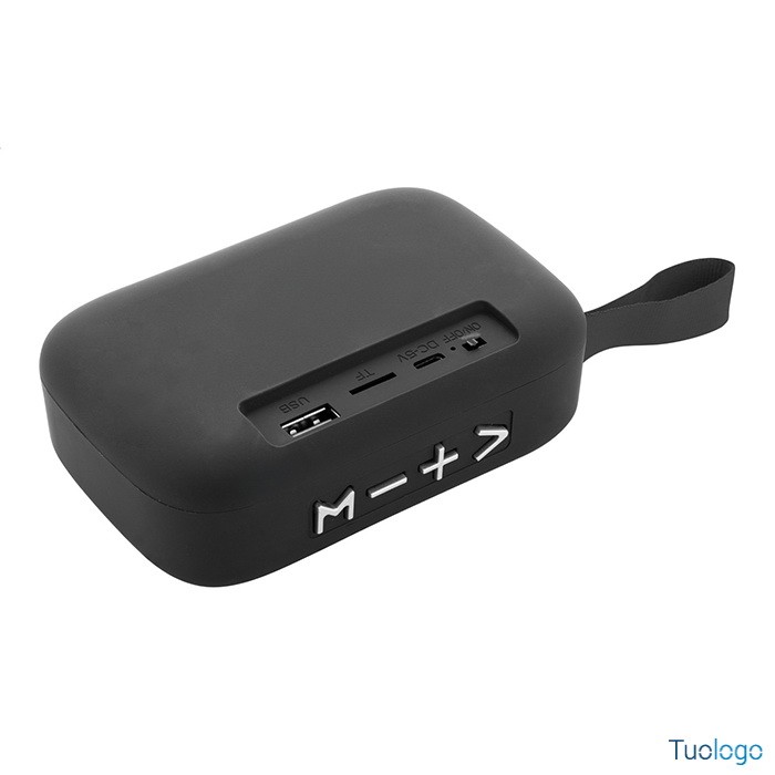 Cassa bluetooth Bugi. Cassa bluetooth con struttura in plastica e rivestimento in poliestere, con batteria ricaricabile incorporata 250 mAh e cavo di ricarica USB incluso. Dimensioni: cm 11,5×7,7×4.