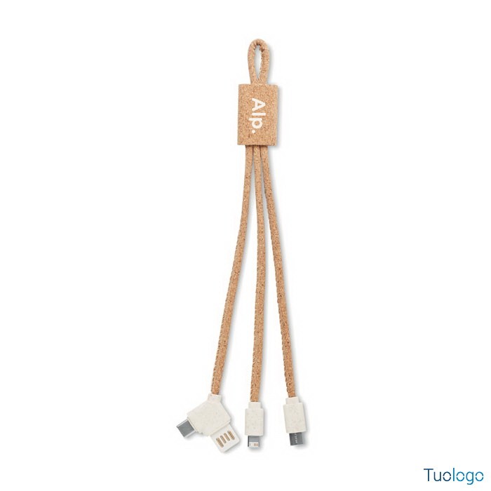 Cavo di ricarica Amora. Cavo di ricarica Cork 3 in 1. Ingresso tipo A e tipo C. Uscita 3 tipi. Dimensioni: cm 22x2,1x0,7.