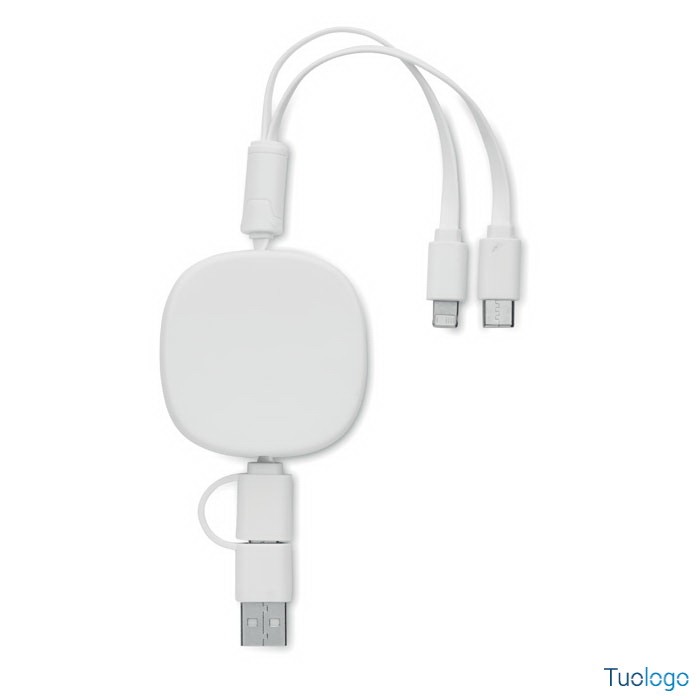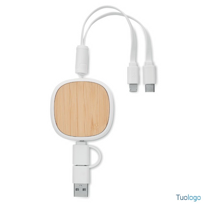 Cavo di ricarica USB Feltre. Cavo di ricarica USB in ABS con dettaglio superiore in bamboo. Ingresso: 2 in 1 tipo C e tipo A. Uscita: connettore di tipo C e micro-B 2 in 1 e illumin. Dimensioni: cm 53x53x16.