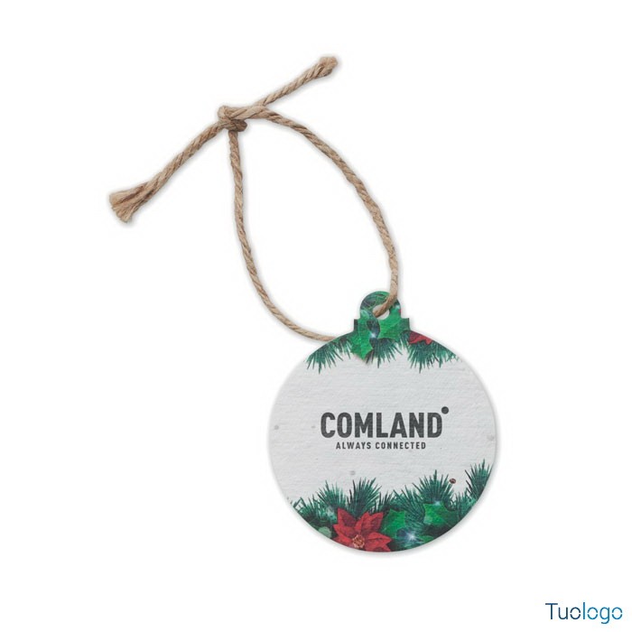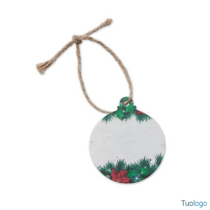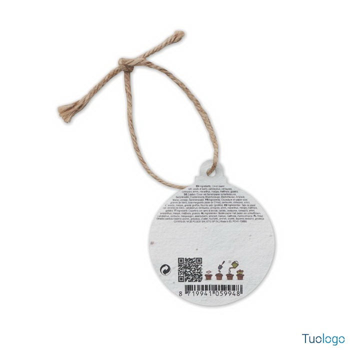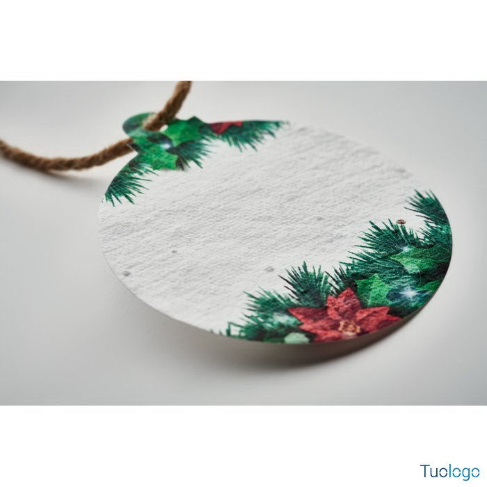 Decorazione con semi Torria. Decorazione natalizia in carta con semi di fiori di campo, con corda di juta, a forma di pallina natalizia. Si pianta e crescerà un prato fiorito. Prodotto in UE. Dimensioni: cm 8x7x0,2.