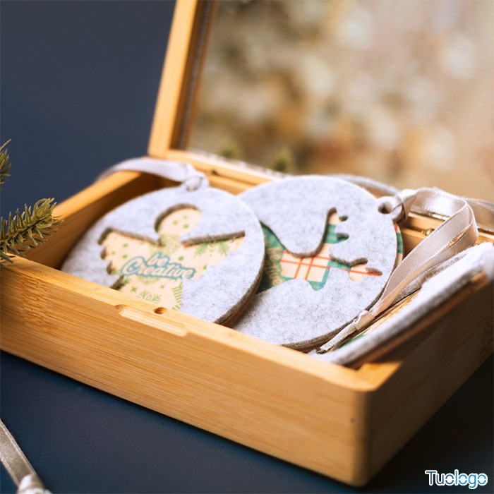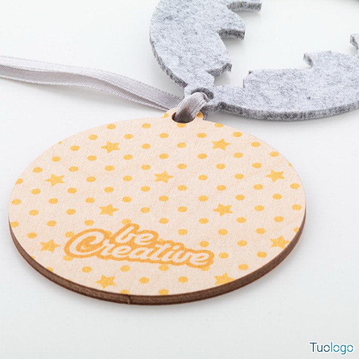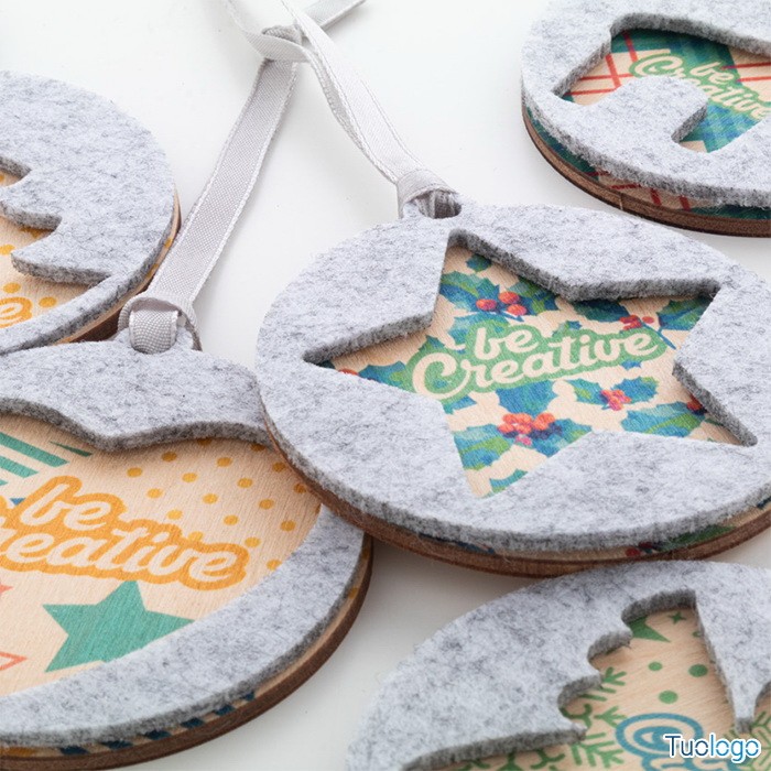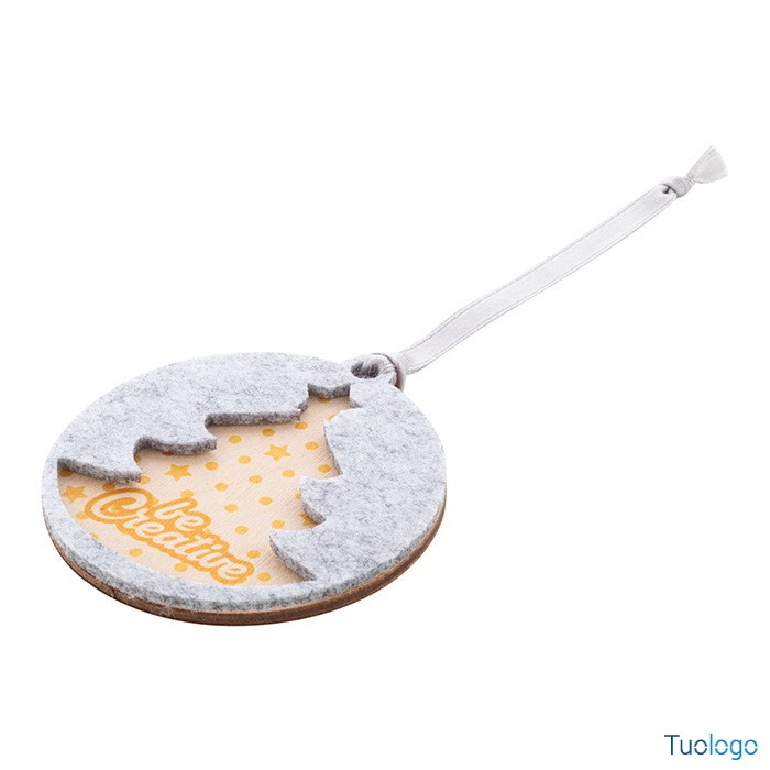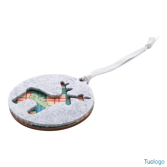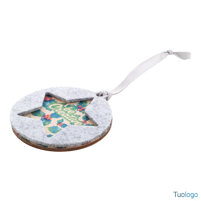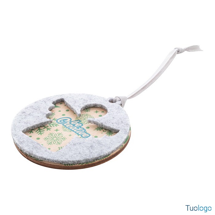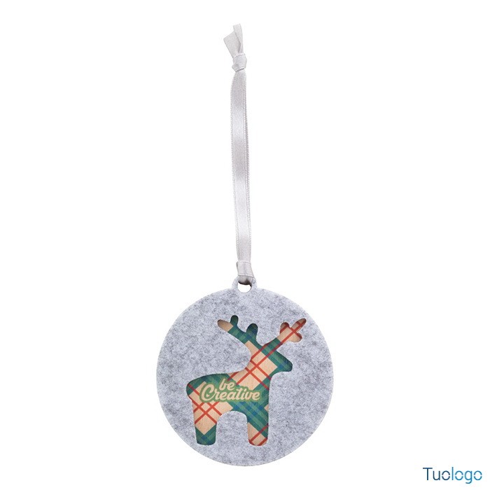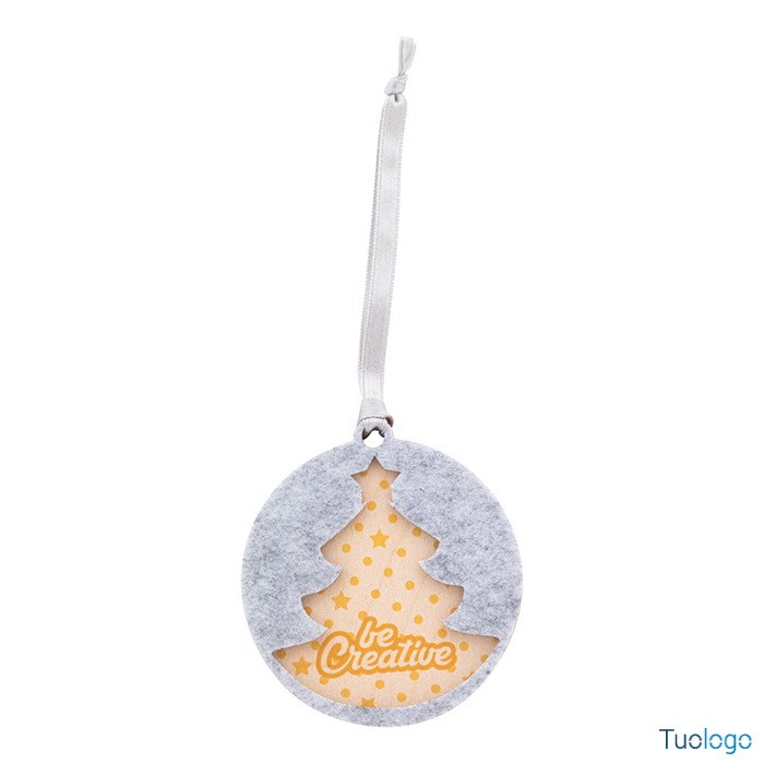 Decorazione nataliza Critfe. Ornamento per albero di Natale in feltro RPET a doppio strato e compensato, con nastro argentato e disegno natalizio fustellato sullo strato superiore. Dimensioni: diam mm 75x75x6.
