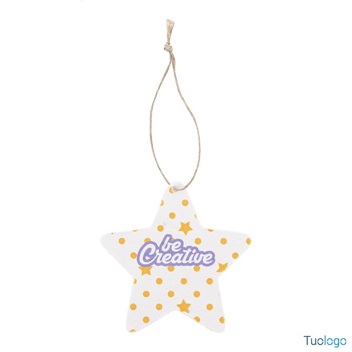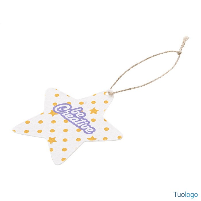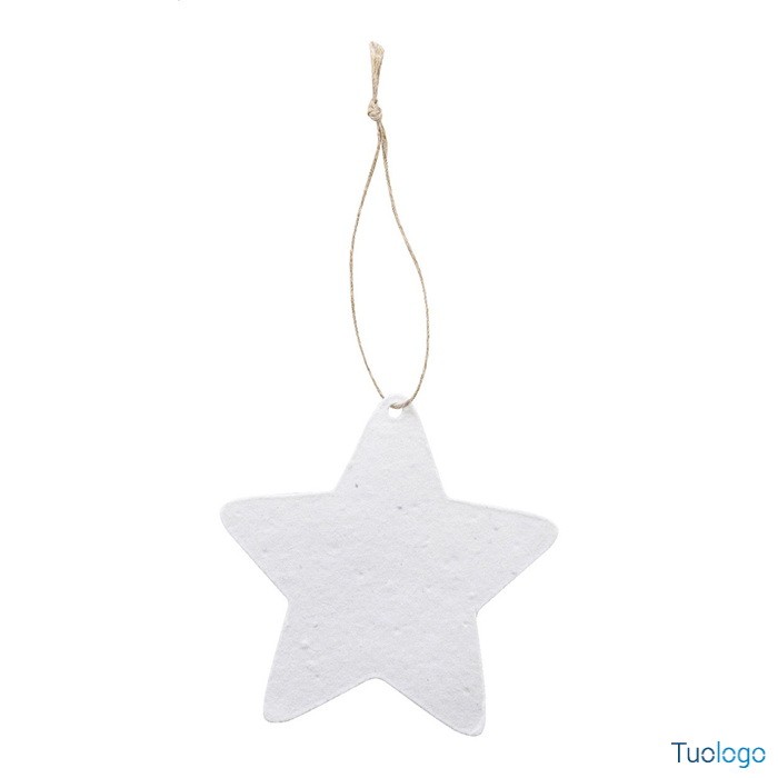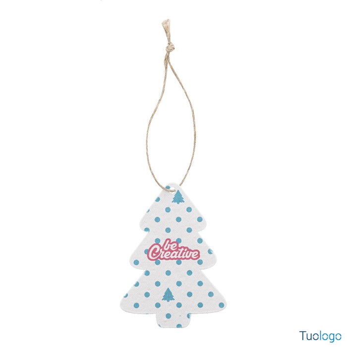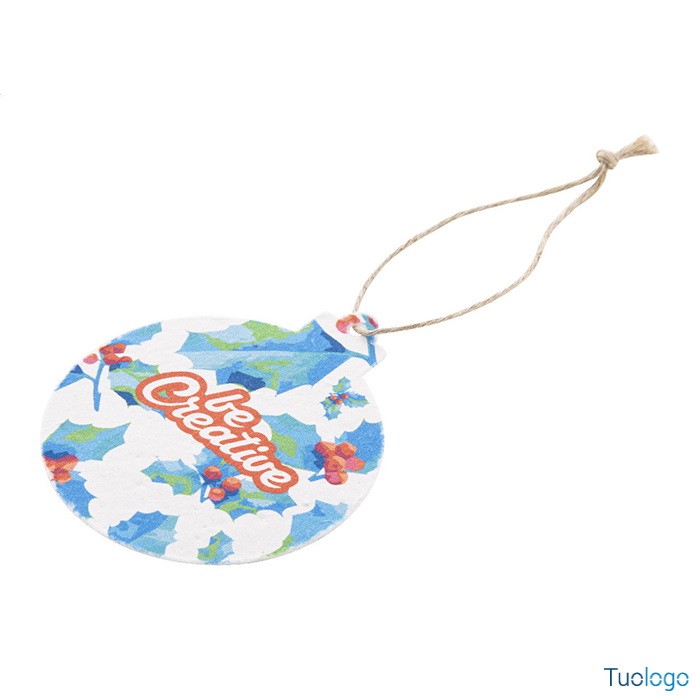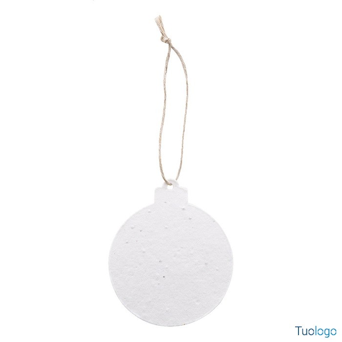 Decorazione natalizia Cuo. Decorazione per albero di Natale in carta di seme e cordoncino in fibra di lino, personalizzabile con stampa a colori. Il costo comprende la stampa digitale su un lato. Dimensioni: cm 7,2x8,5.