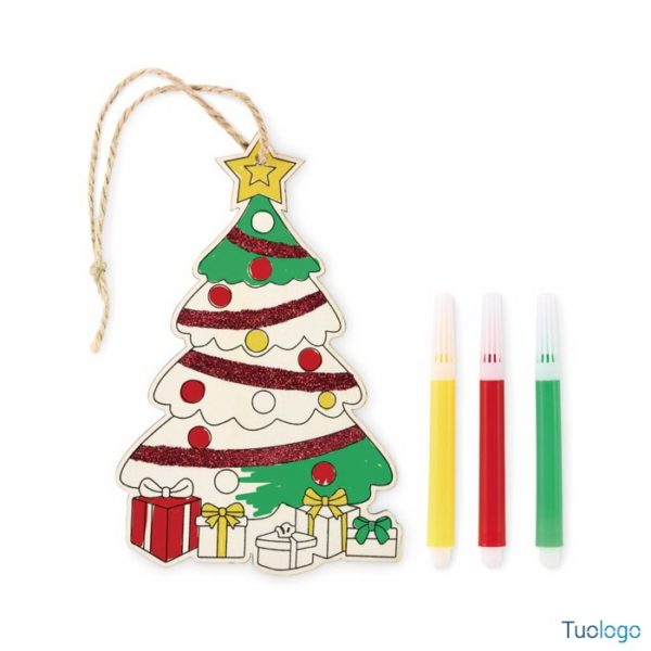 Decorazione natalizia Lainio. Decorazione per albero di Natale in legno di pioppo con 3 pennarelli da colorare e cordoncino di iuta. Dimensioni: 9x3,7x0,2 cm.