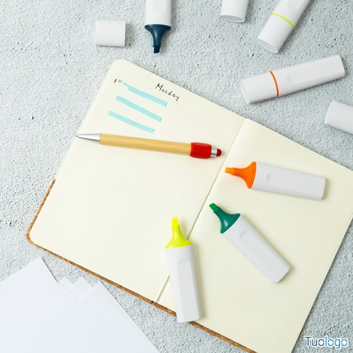 Evidenziatore in plastica ABS Wado. Evidenziatore in plastica ABS riciclata con cappuccio. Dimensioni: diam cm 2,7×10,5×1,7.