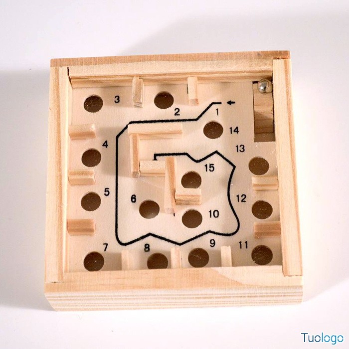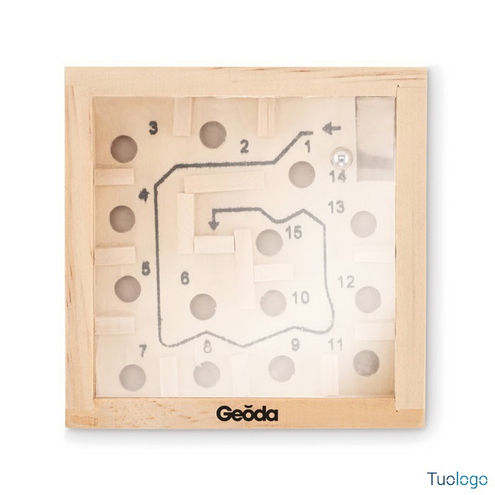 Gioco labirinto Rogil. Gioco del labirinto in legno di pino. Dimensioni: cm 9x9x2,5.