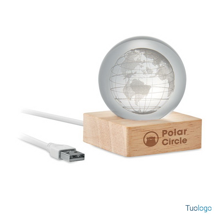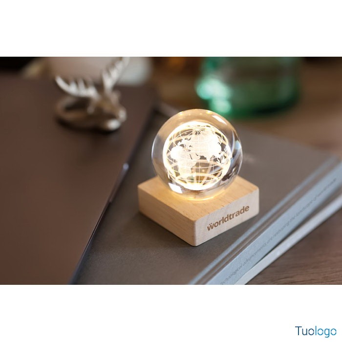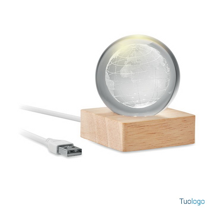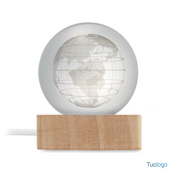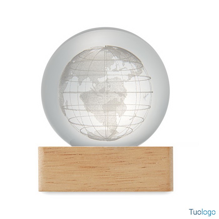 Globo di vetro con luce Colon. Globo di vetro con luce LED su una base in legno di gomma. Include un cavo di ricarica USB. Dimensioni: 5,9x5,9 cm