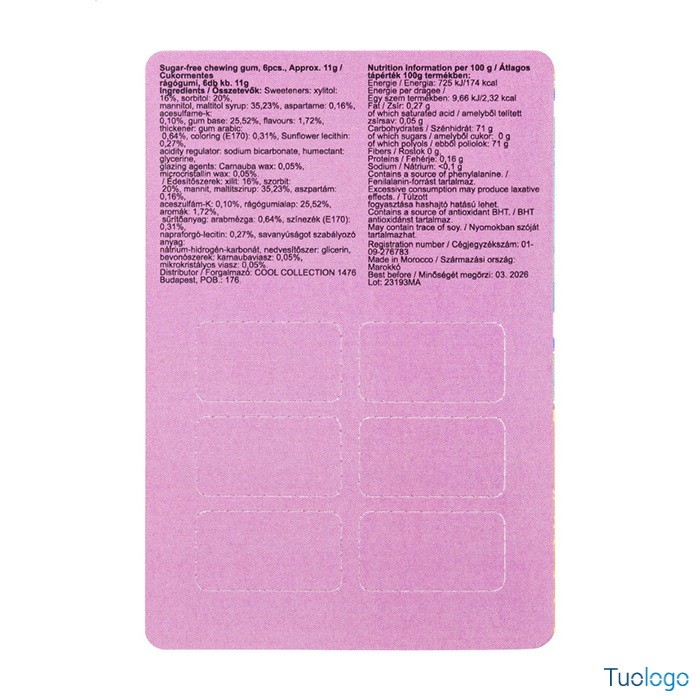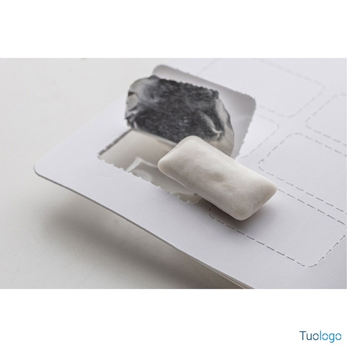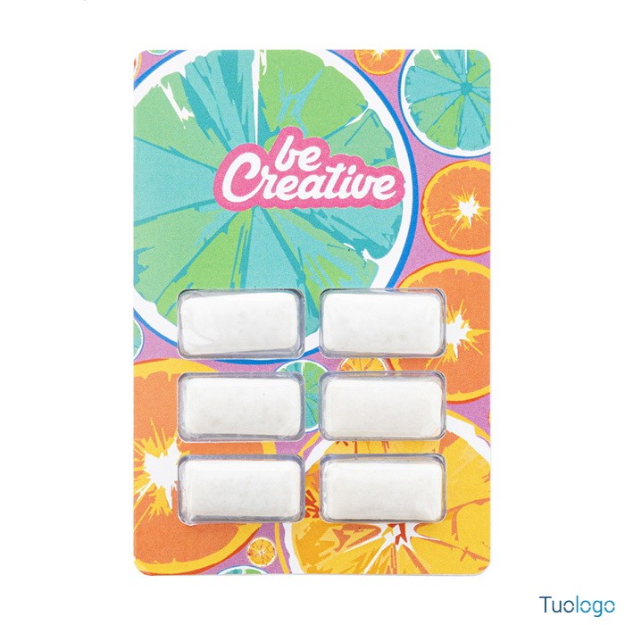 Gomme da masticare Rit. CreaChew Deluxe: blister di 6 gomme da masticare senza zucchero con fascetta in cartoncino stampato a colori. Dimensioni: cm 6,8x10x0,6.