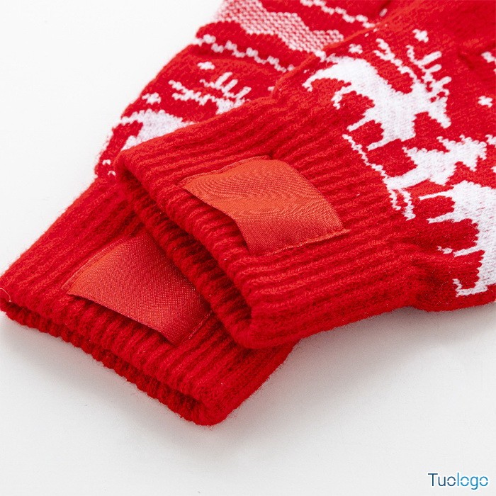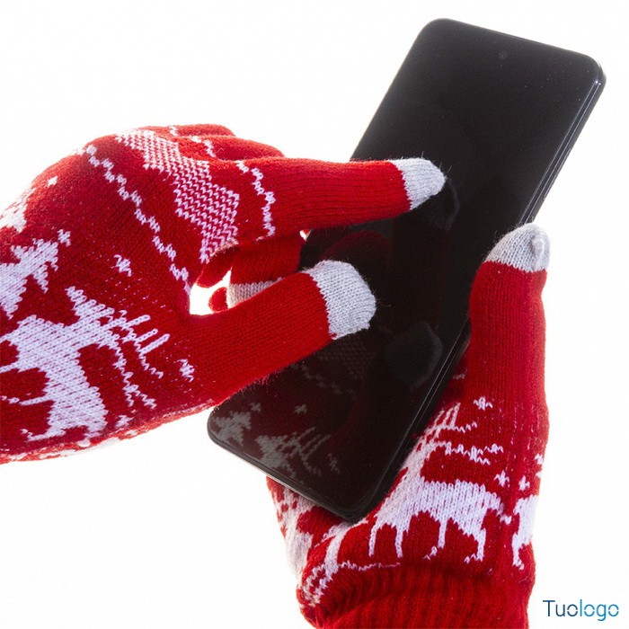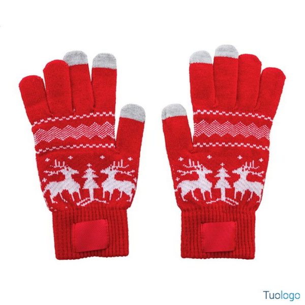 Guanti natalizi Chanan. Guanti natalizi in acrilico lavorati a maglia con patch stampabili e 3 polpastrelli capacitivi. Disponibili in taglia unica per adulti.