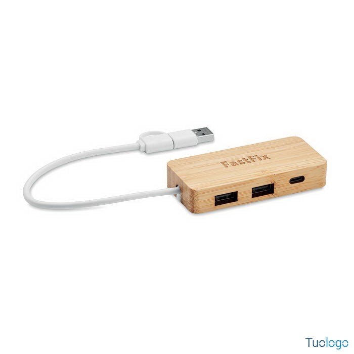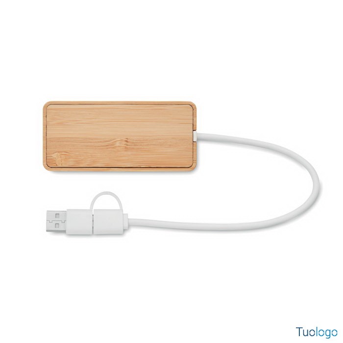 Hub USB C A Agna. Hub USB C A a 3 porte con custodia in bamboo. 1 x Tipo C e 2 x Tipo A. Uscita: 2 x Tipo A e 1 x Tipo C. Ingresso: 2 in 1 Tipo C e Tipo A. Lunghezza del cavo: 20 cm. Dimensioni: cm 8,7x4,0x1,5.