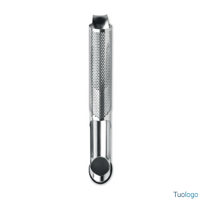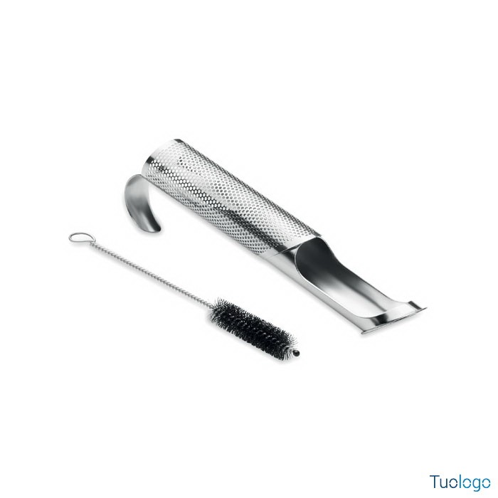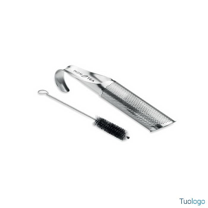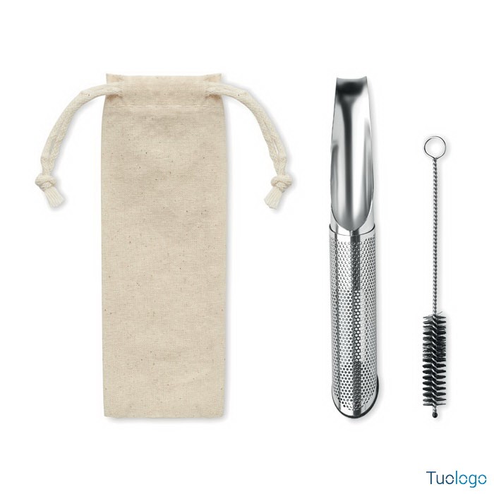 Infusore tè Mignanego. Set infusore tè in acciao con gancio per appenderlo alla tazza e scovolino per la pulizia, in sacchetto di cotone personalizzabile. Dimensioni: cm 15x2.