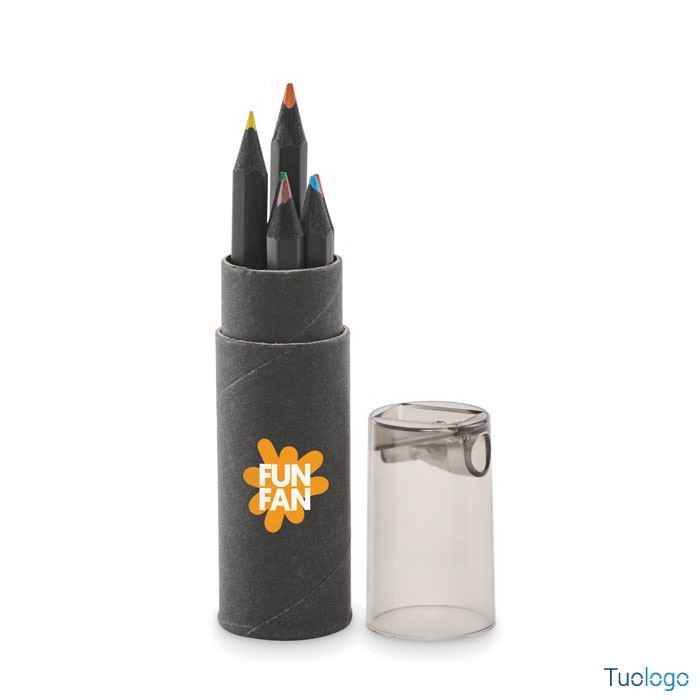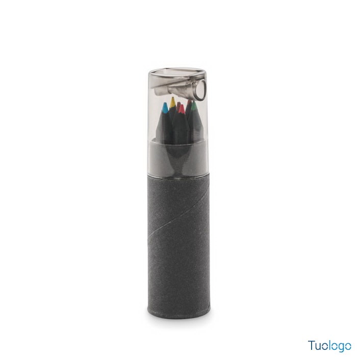 Kit 6 matite con temperino incorporato Lobo. Confezione di carta colorata con 6 matite da colorare e un temperamatite nel coperchio della scatola. Dimensioni: cm 2.7x10.4.