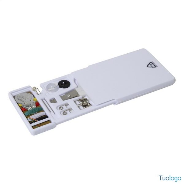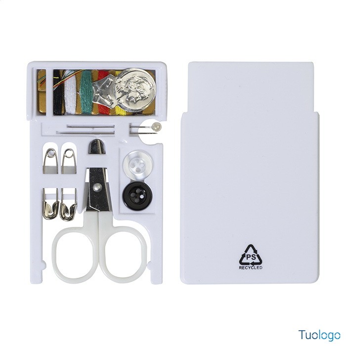 Kit da cucito Taleh. Kit da cucito da viaggio compatto in una custodia in PS riciclato a forma di cartolina. Include 6 fili di poliestere colorati, forbici, 2 spille da balia, 2 aghi, 2 bottoni. Dimensioni: cm 9×5,5×0,7. infila ago.