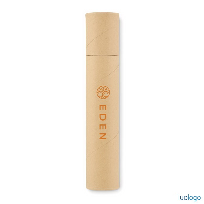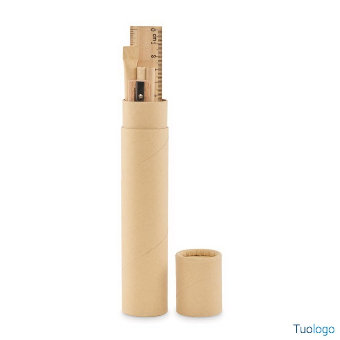 Kit di cancelleria Guariera. Scatola in tubo di carta con 2 matite, 1 penna in cartone, 1 temperino in legno e 1 gomma. Dimensioni: cm 3.6x19.5.