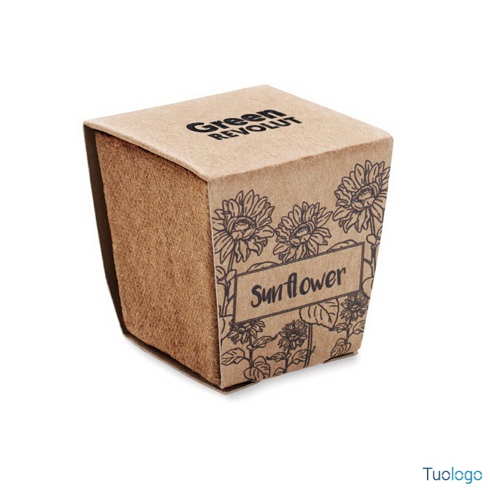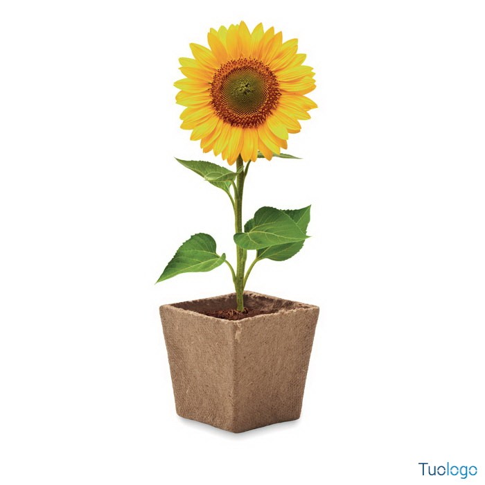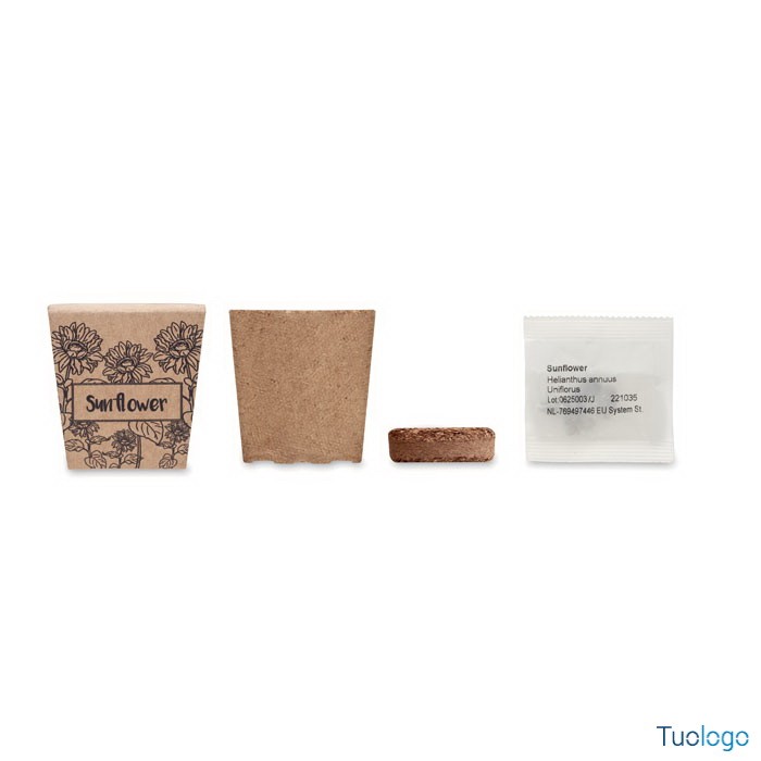 Kit girasole. Kit con vaso di torba biodegradabile, terriccio con semi di girasole. Prodotto in UE. Dimensioni: cm 4,3x4,3x4,5.