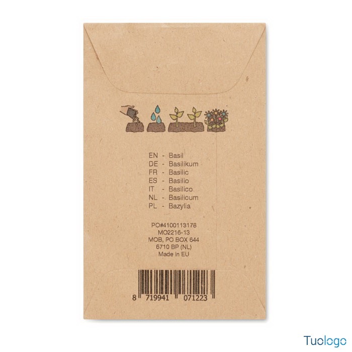Kit per coltivare Basilico. Semi di basilico in busta kraft. Prodotto in EU. Dimensioni: cm 10,5x6,5.