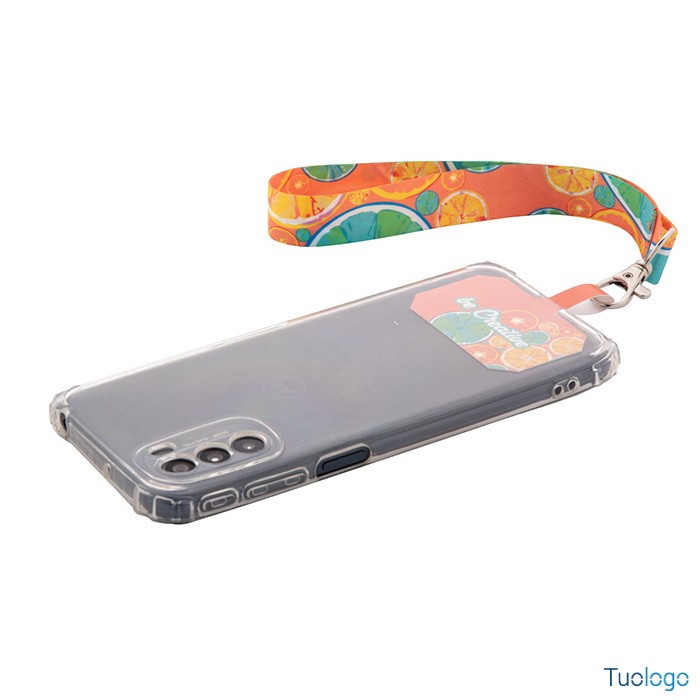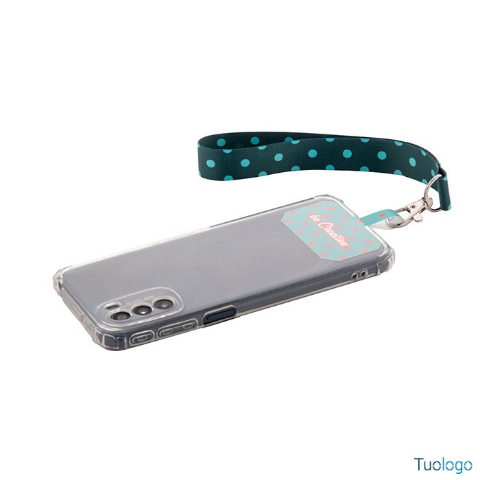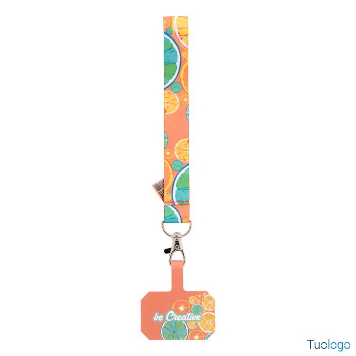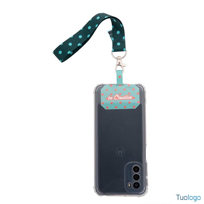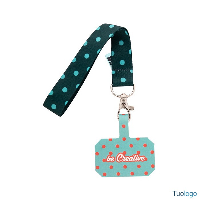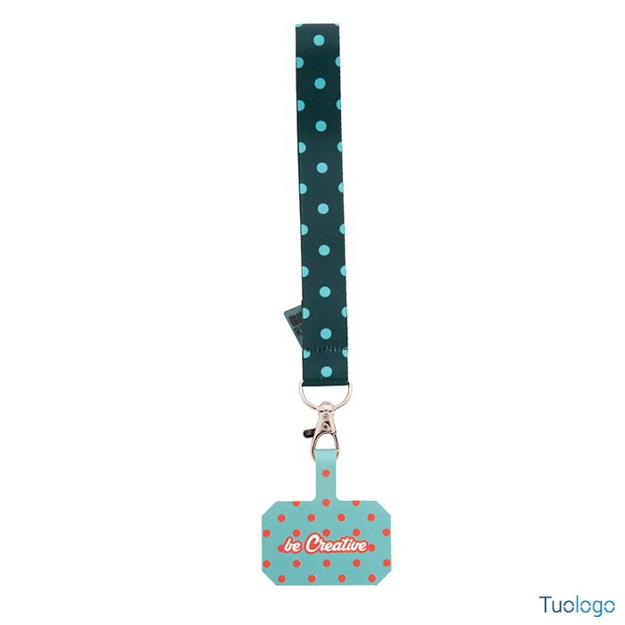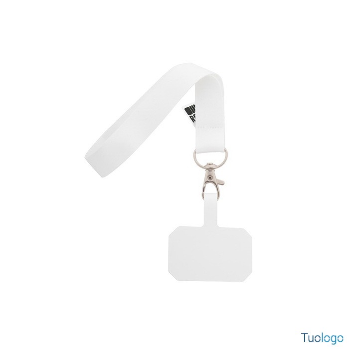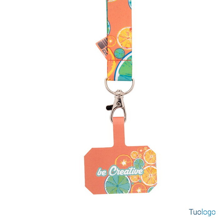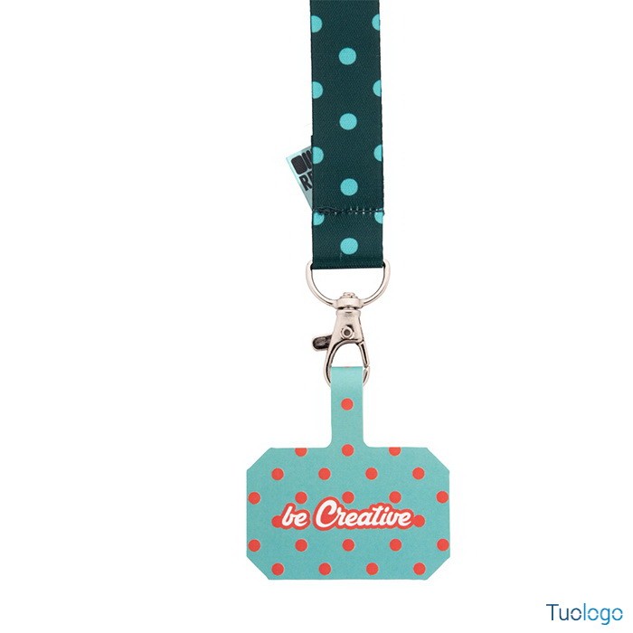 Il laccetto è in PET riciclato, mentre l'inserto portacellulare è realizzato in carta antistrappo stampata a colori. Questo materiale è robusto e resistente, garantendo la sicurezza del tuo dispositivo mobile.