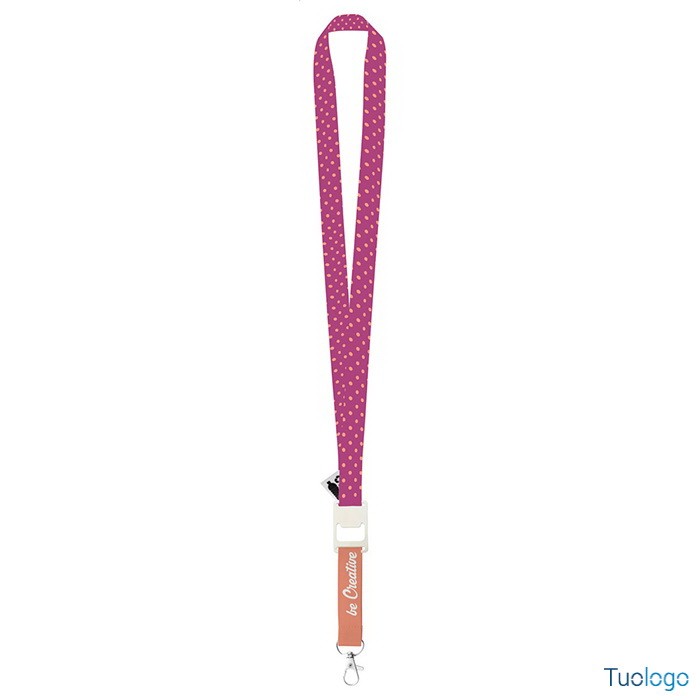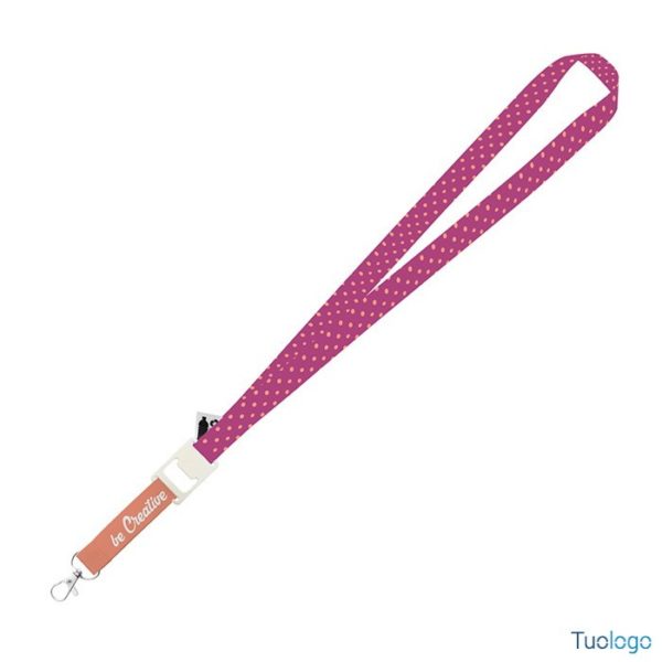 Laccetto portabadge Drink RPET. Lanyard in RPET personalizzabile, con moschettone in metallo ed apri bottiglie, stampa in sublimazione su entrambi i lati. Dimensioni: cm 61x3.