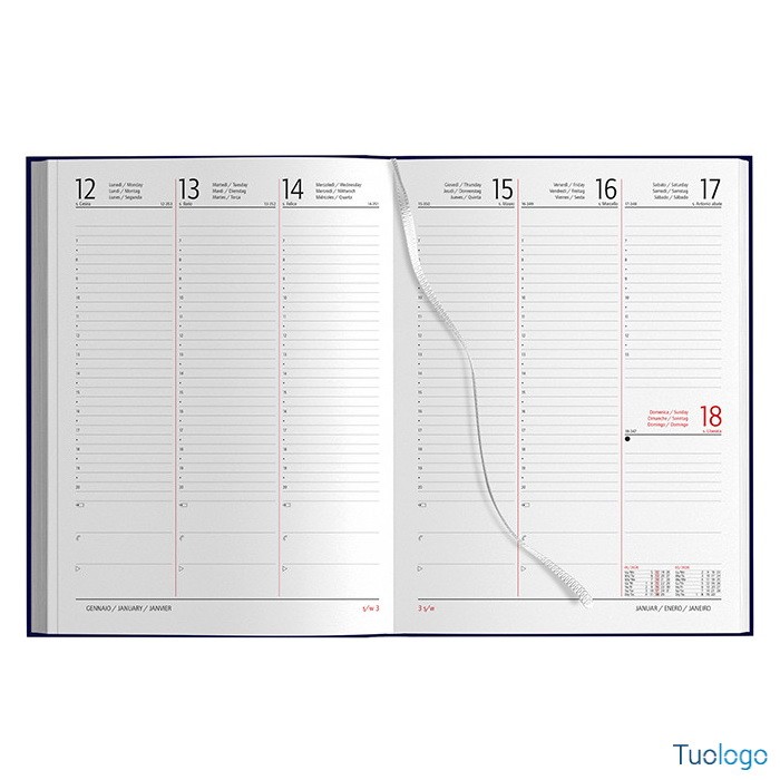 Maxi agenda settimanale 21x29.7. 132 pagine, carta bianca, edizione multilingue, rubrica telefonica. Il prezzo include la stampa a un colore. Dimensioni: cm 21x29.7. Quadranti imbottiti, segnapagine, inserto cartografico. Astuccio disponibile su richiesta. Imballo da 20.