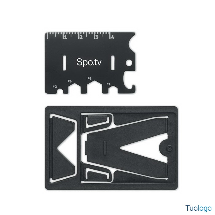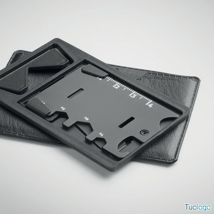 Multiutensile e supporto smartphone. Multiutensile in acciaio inox e PP 7 funzioni in custodia in PU. Include cacciaviti, righello, chiave esagonale e apribottiglie, supporto smartphone. Dimensioni: cm 9,5x6,5.