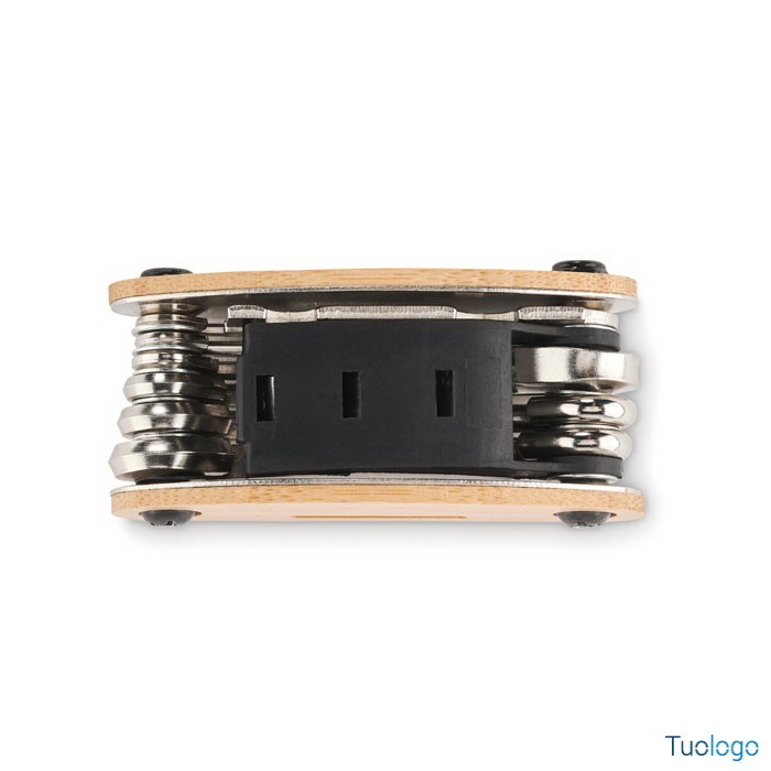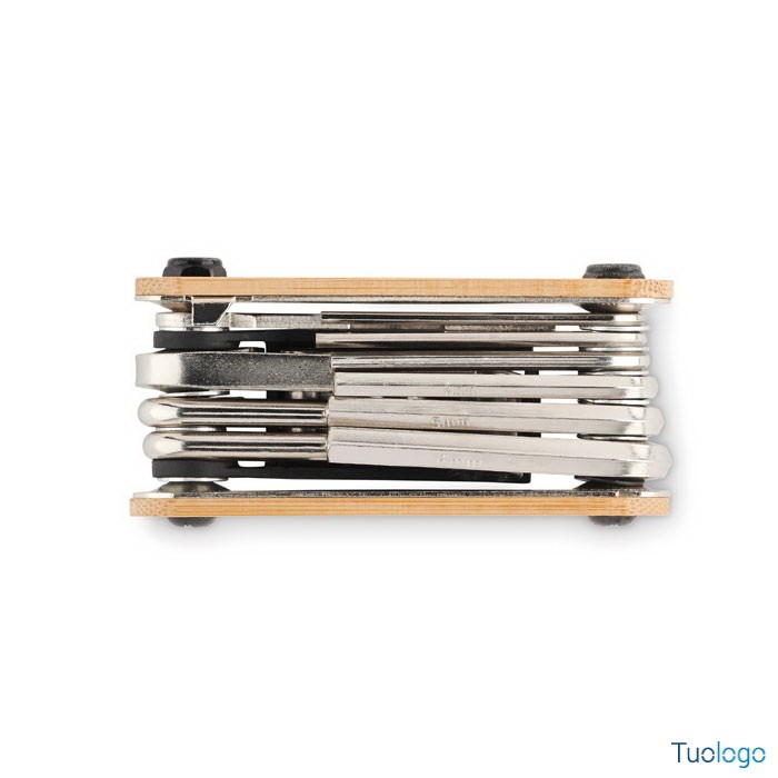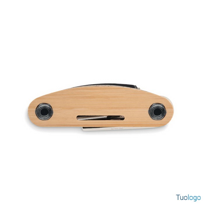 Multiutensile in bamboo Mosio. Utensile tascabile multifunzione in acciaio inossidabile con copertura in bamboo. 11 funzioni. Include chiavi esagonali, chiave piatta, cacciavite Phillips e bussola Dimensioni: cm 9x2,5x3,8.