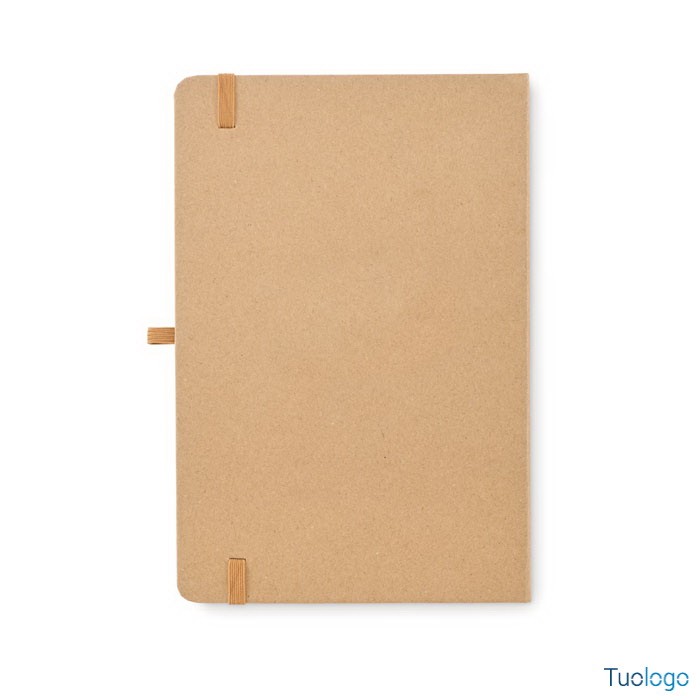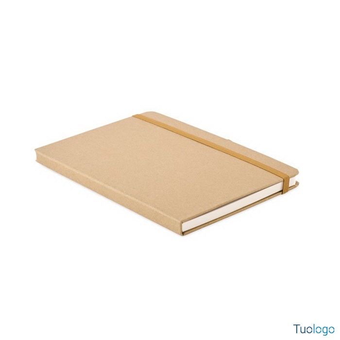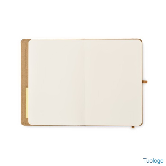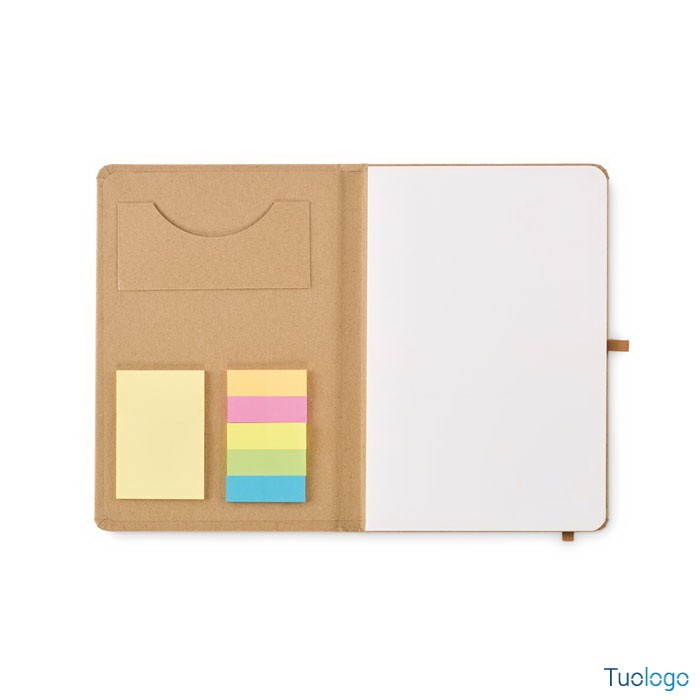 Notebook A5 con copertina in cartone Yasal. Notebook A5 con copertina in cartone con 80 fogli di carta riciclata (160 pagine) 25 fogli di note adesive e 25 memopad. Cinturino di chiusura elastico e portapenne.Dimensioni: cm 14x1.3x21.