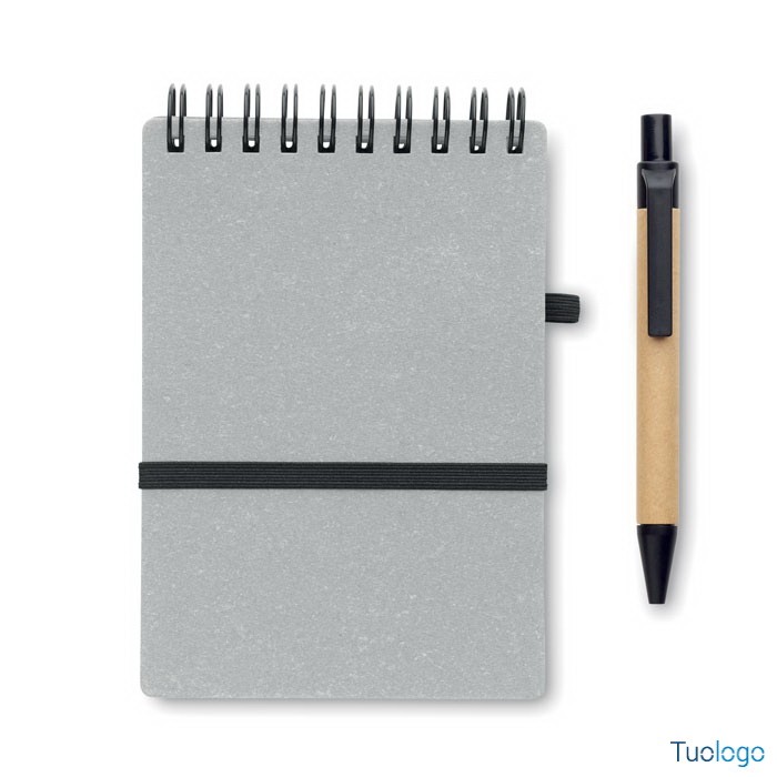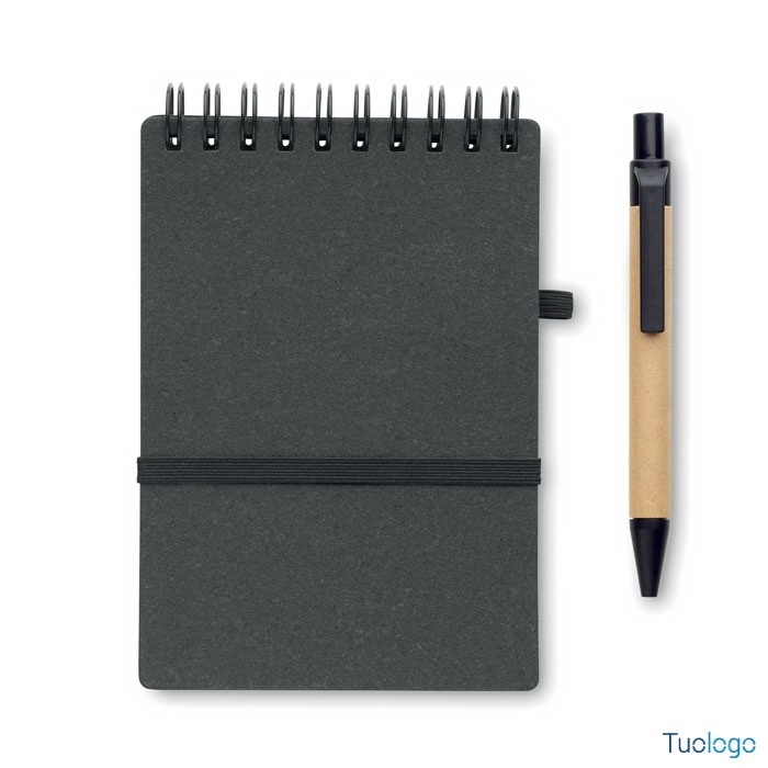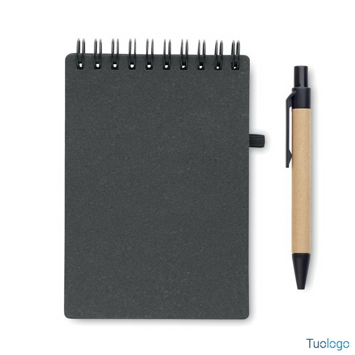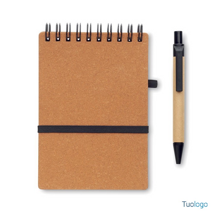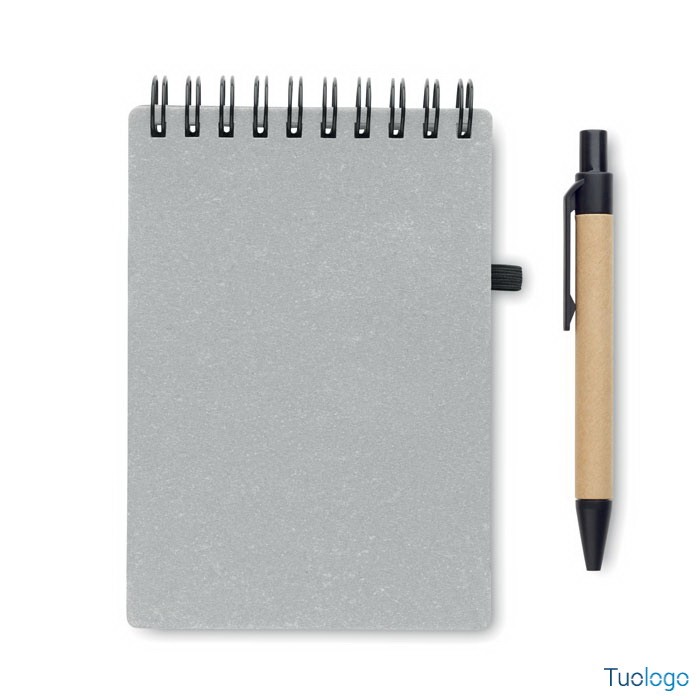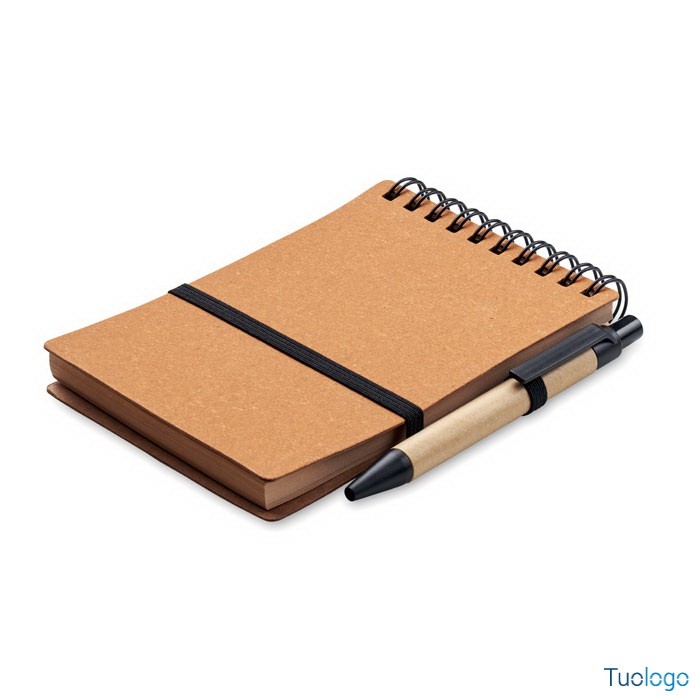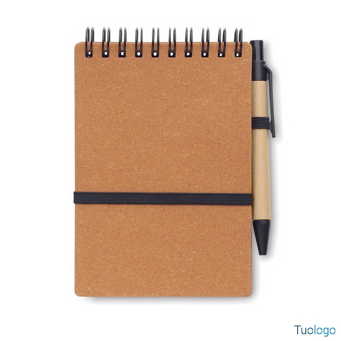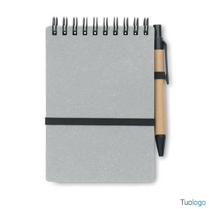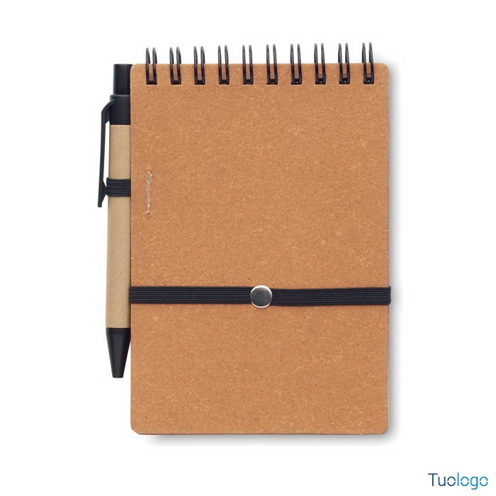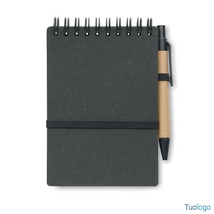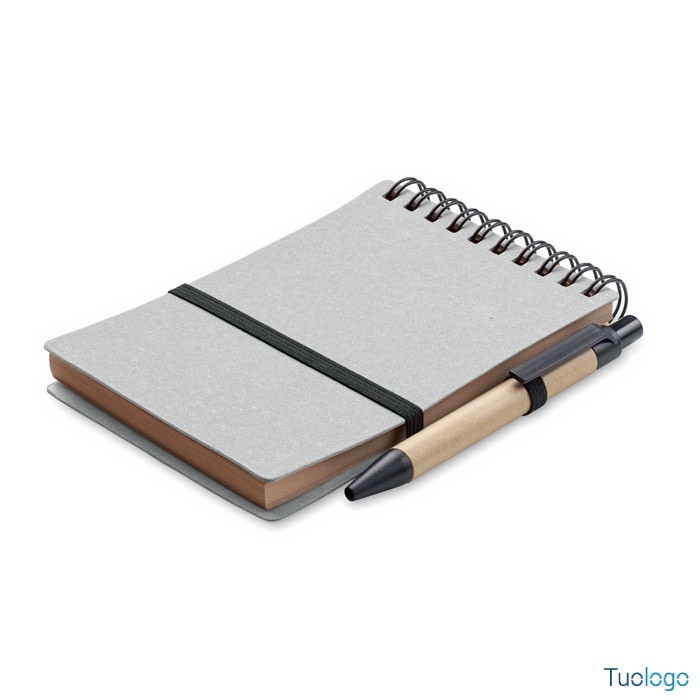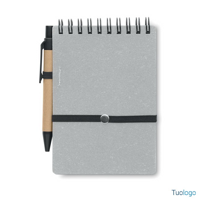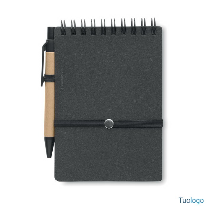Notebook in carta riciclata e PU Peyrano. Notebook in carta riciclata e PU. Rilegatura a doppio filo. 140 pagine in carta riciclata a righe (70 fogli). Penna a sfera a pulsante abbinata in cartone riciclato. Dimensioni: cm 9x13.