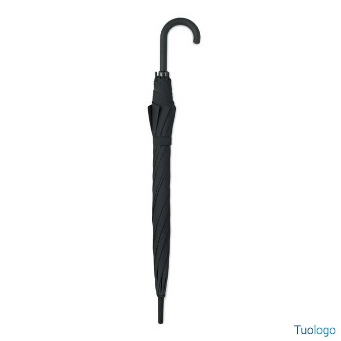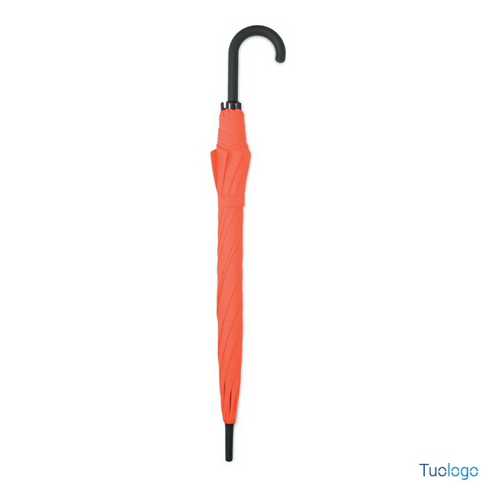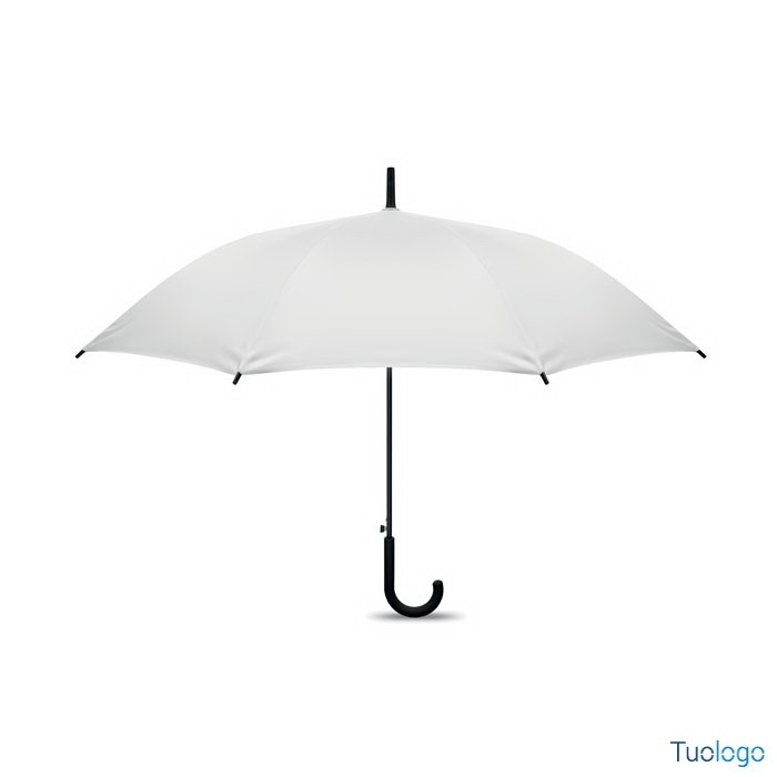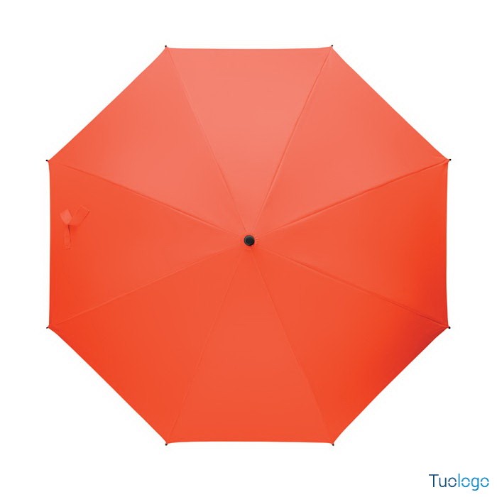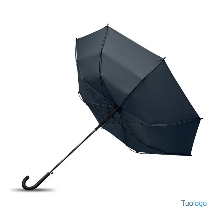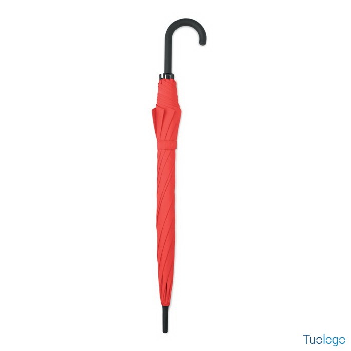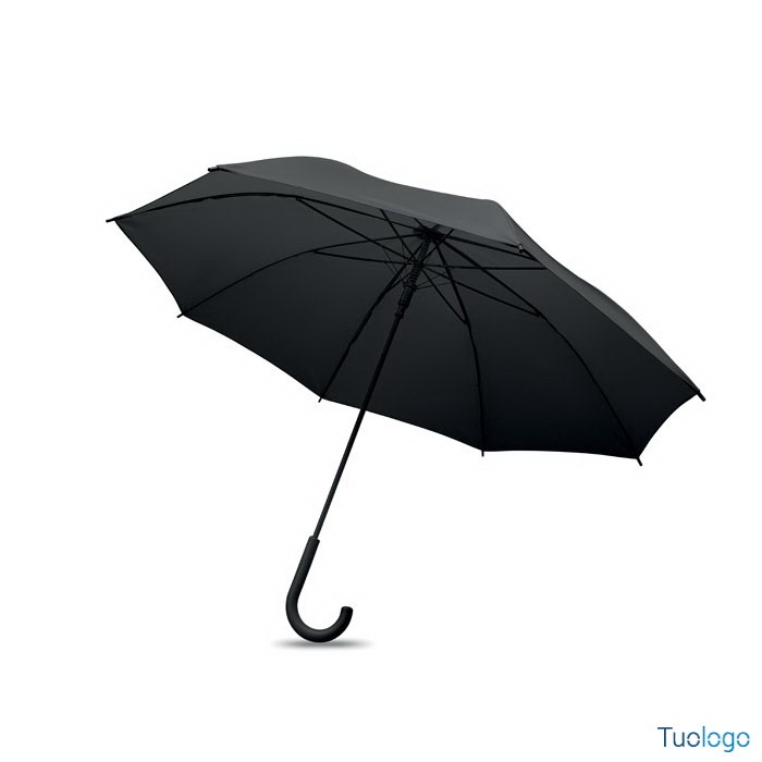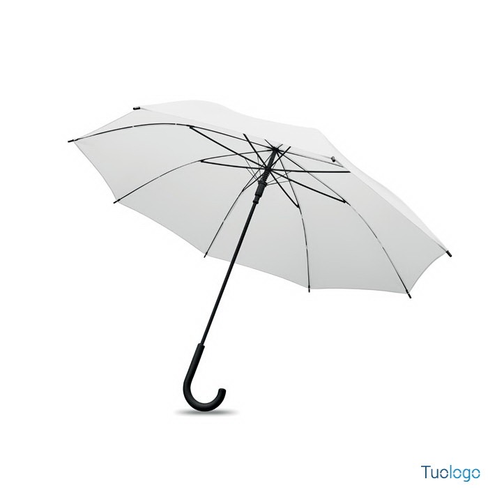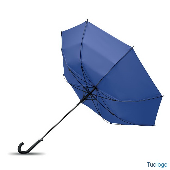 Ombrello antivento Paraiso. Ombrello antivento dritto ad apertura automatica da 23 pollici con struttura in fibra di vetro e pannelli in tessuto pongee 190T. Punte e sommità in plastica. Dimensioni: 58,5 cm Manico curvo in plastica PP gommata. Chiusura manuale.