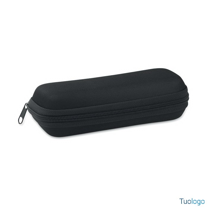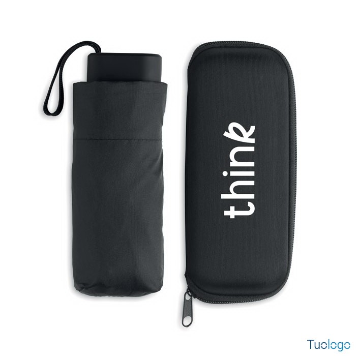 Ombrello antivento pieghevole Arias. Ombrello antivento da 19 pollici a 5 segmenti con apertura e chiusura manuale in pongee 190T. Presentato in una custodia in EVA. Dimensioni: cm 90x17.