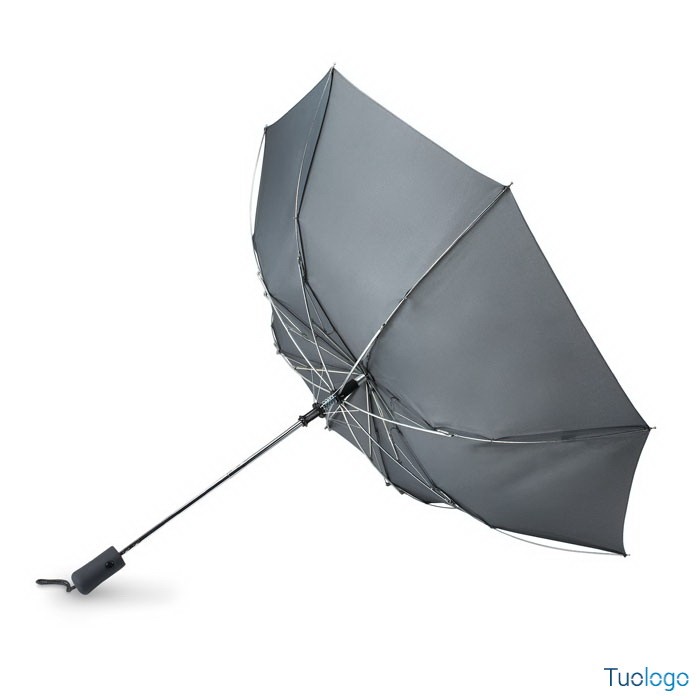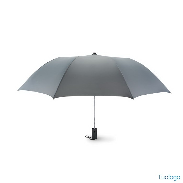 Ombrello grigio scuro richiudibile in poliestere con struttura in acciaio e manico nero in abs
