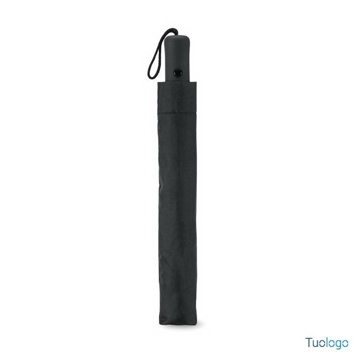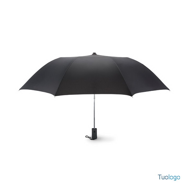 Ombrello nero richiudibile in poliestere con struttura in acciaio e manico nero in abs