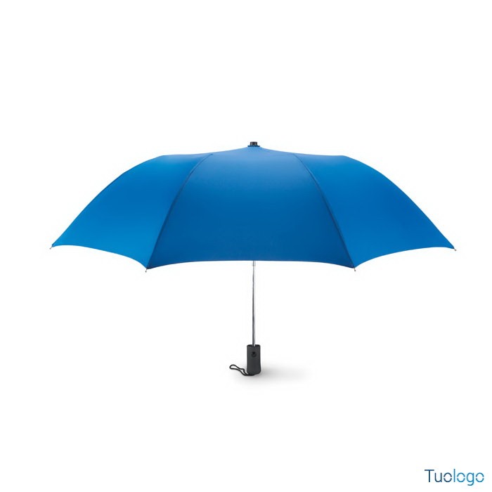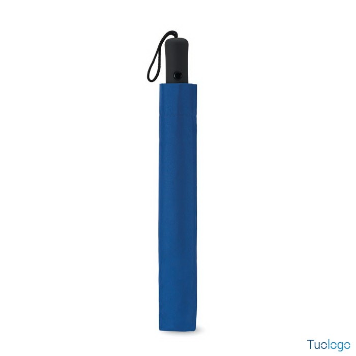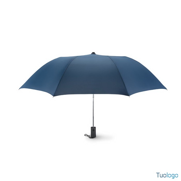 Ombrello blu richiudibile in poliestere con struttura in acciaio e manico nero in abs