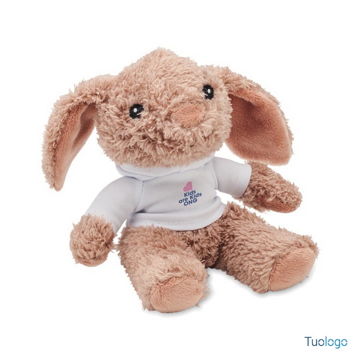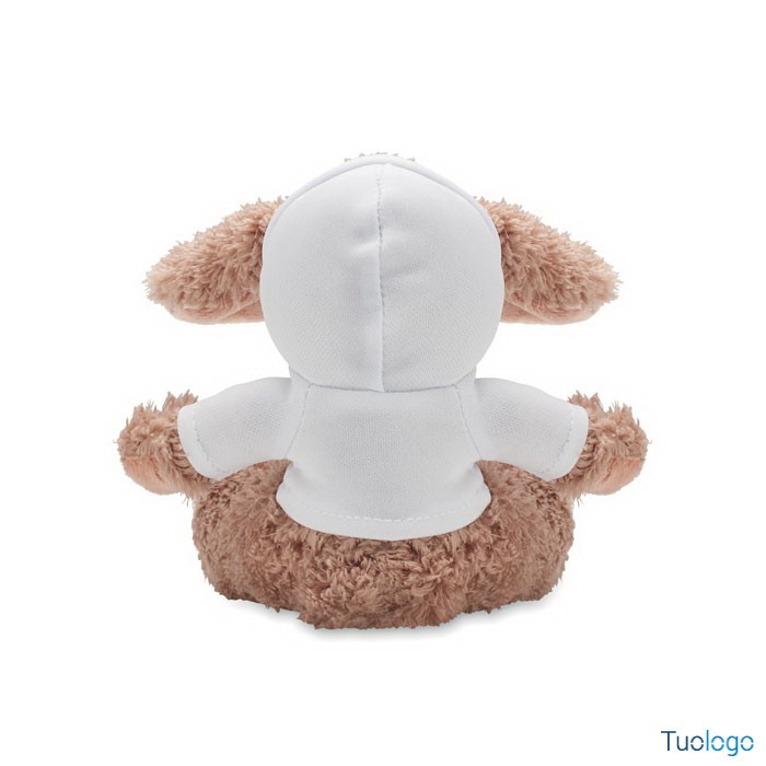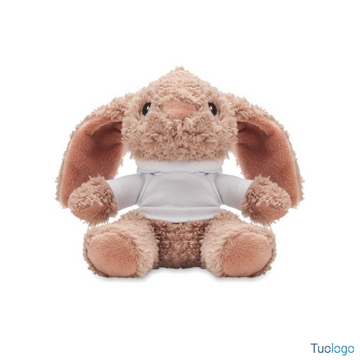 Peluche coniglio Bip. Coniglietto di peluche che indossa un maglione con cappuccio. Ideale per la stampa in sublimazione. Dimensioni: cm 14x10x12.