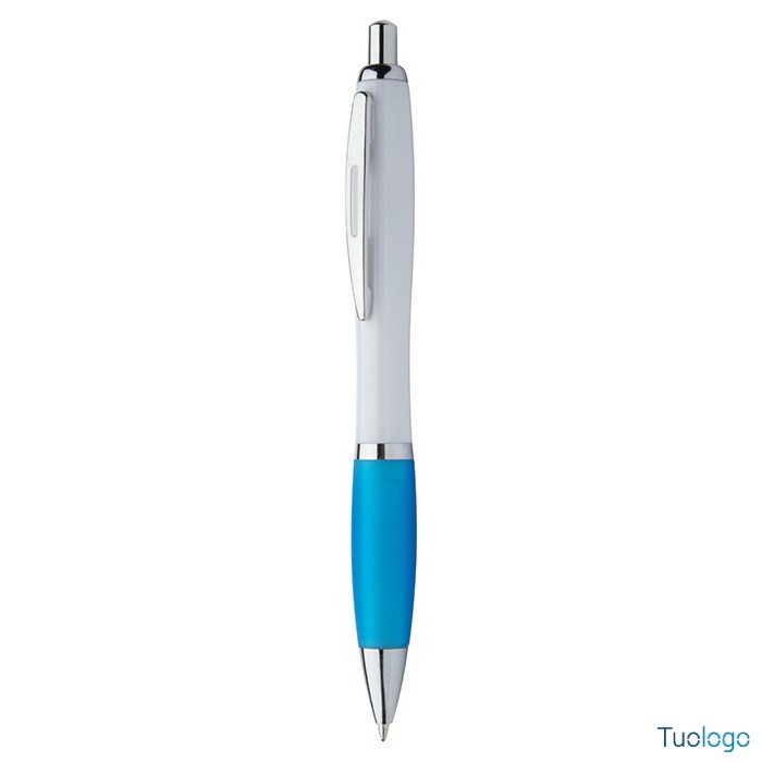 Penna a sfera Easton. Corpo bianco, grip in gomma colorata e dettagli cromati. Refill blu, meccanismo a scatto. Dimensioni: cm 14x1,3.