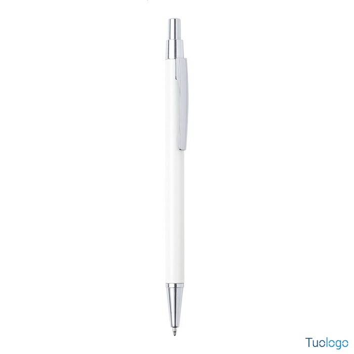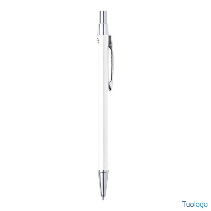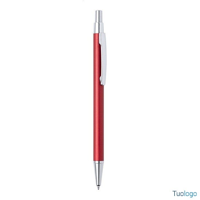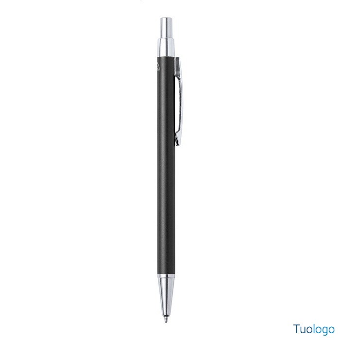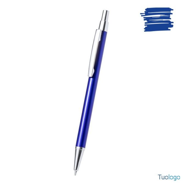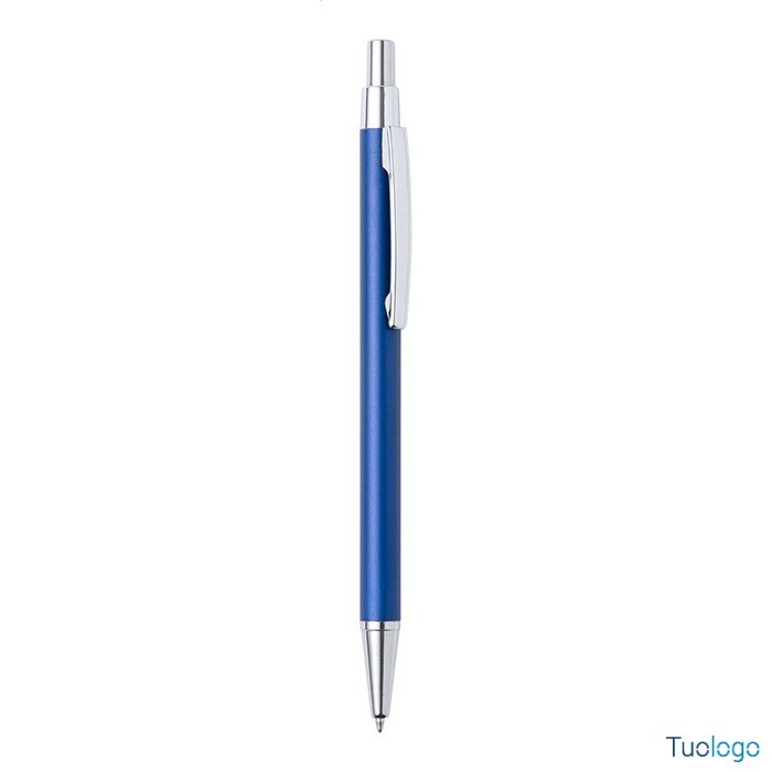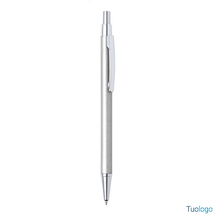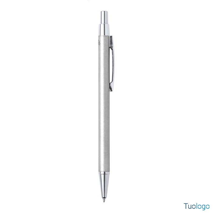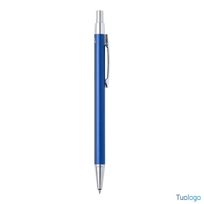 Penna a sfera ecologica Pupuya. Inchiostro blu. Penna a sfera in alluminio riciclato con inserti cromati. Dimensioni: diam cm 0,9x14.