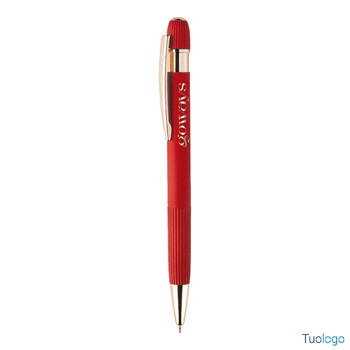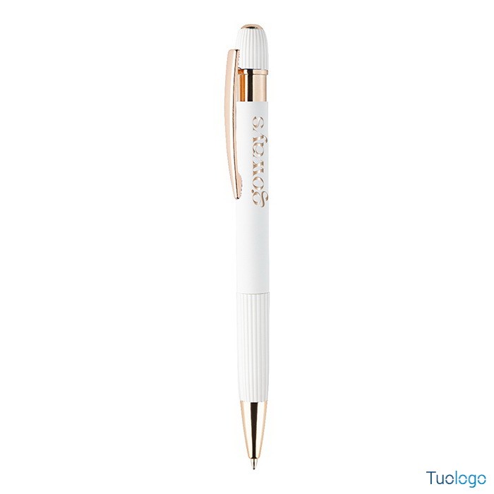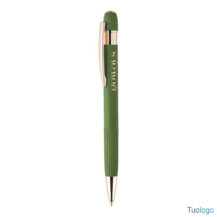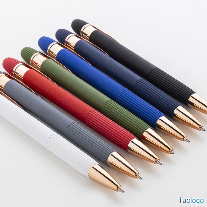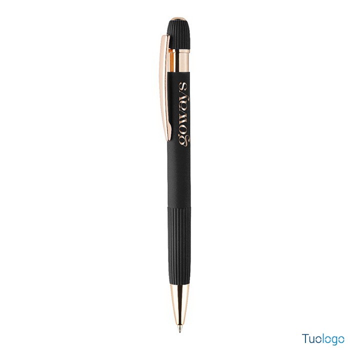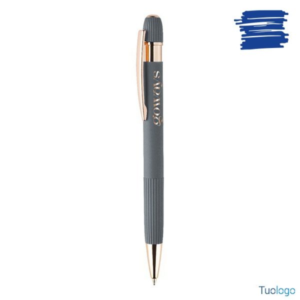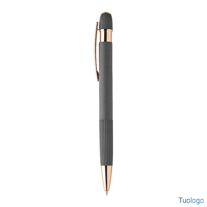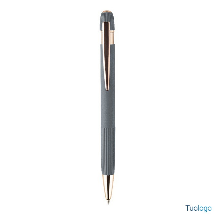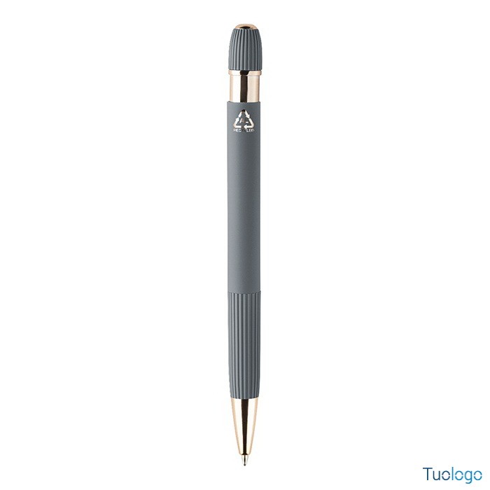 Penna a sfera Keg. Penna a sfera in alluminio riciclato con refill blu, corpo gommato e dettagli in color oro rosa. Dimensioni: cm 1x14.