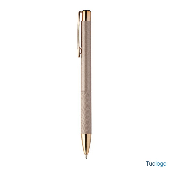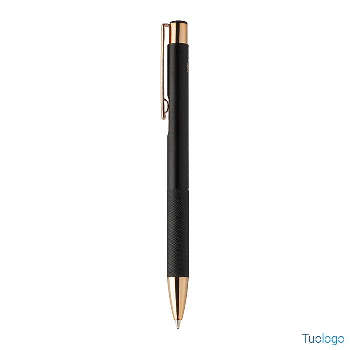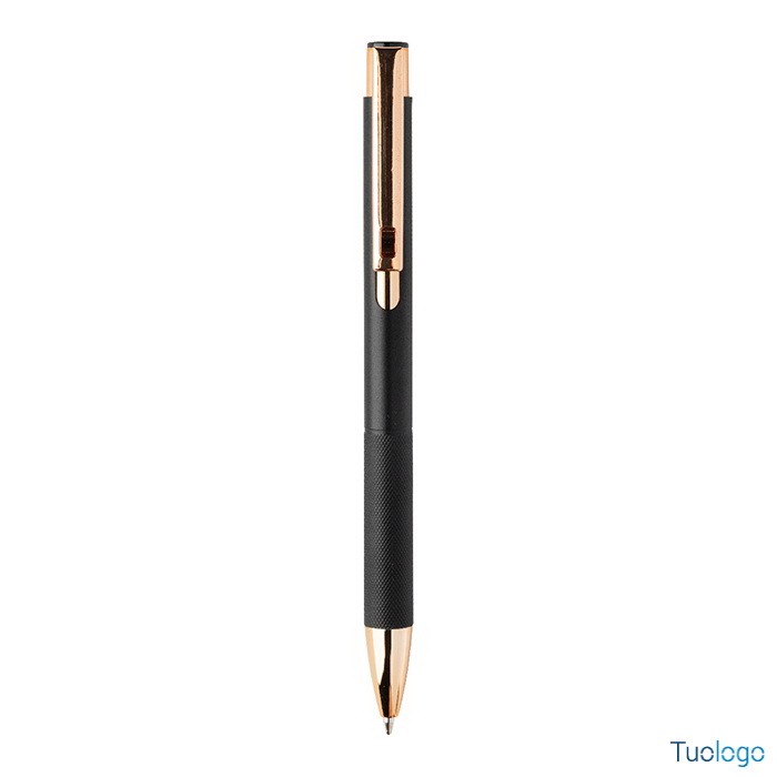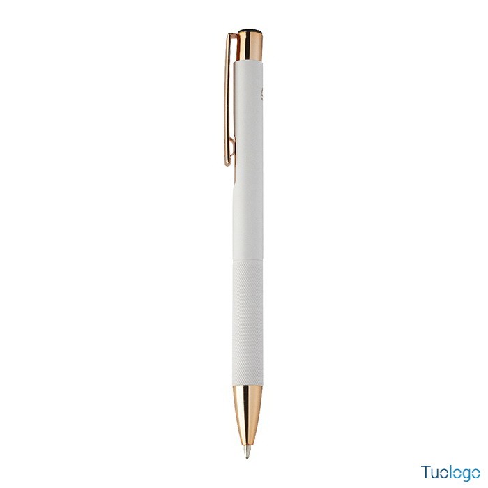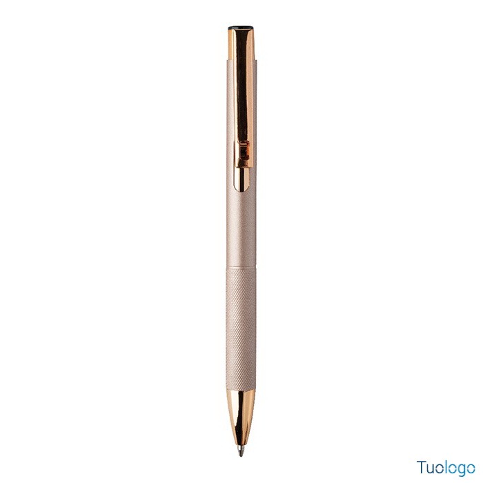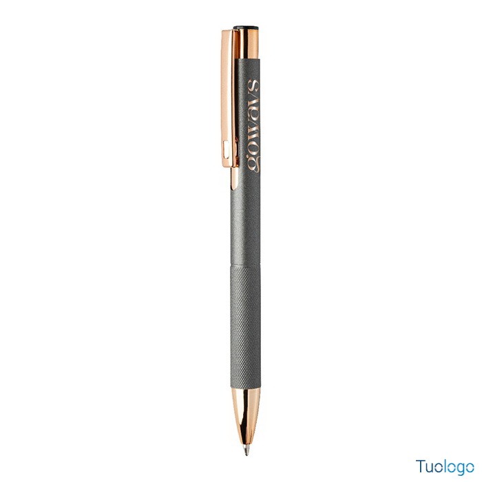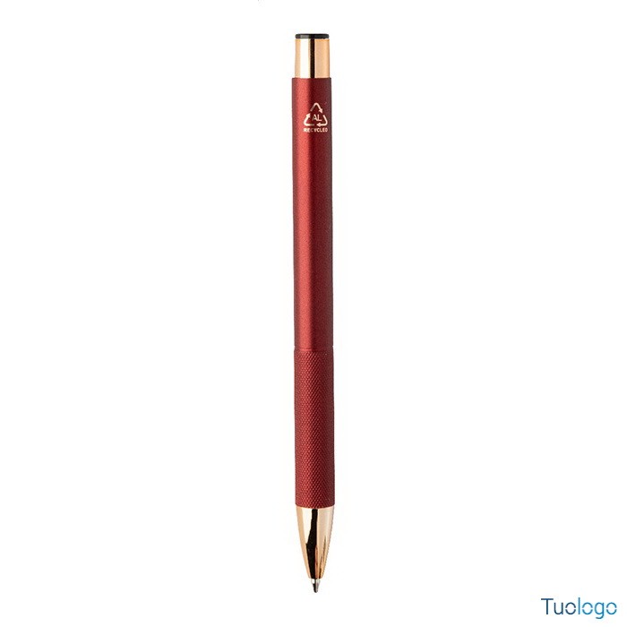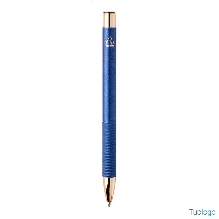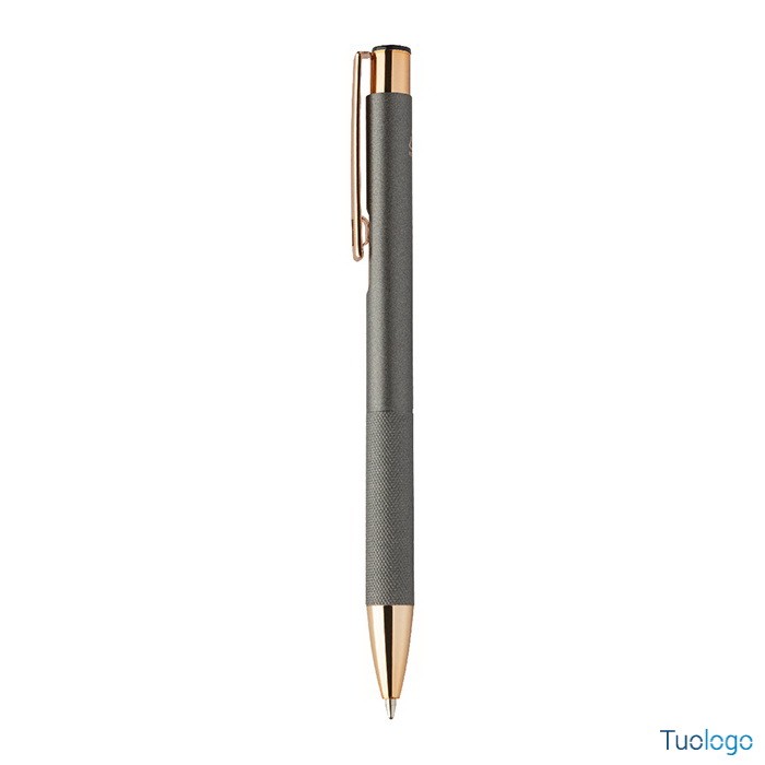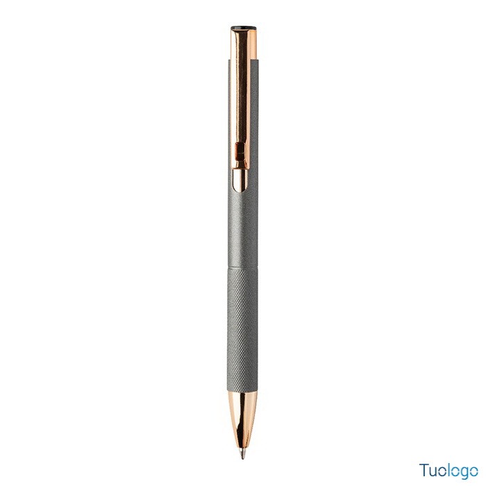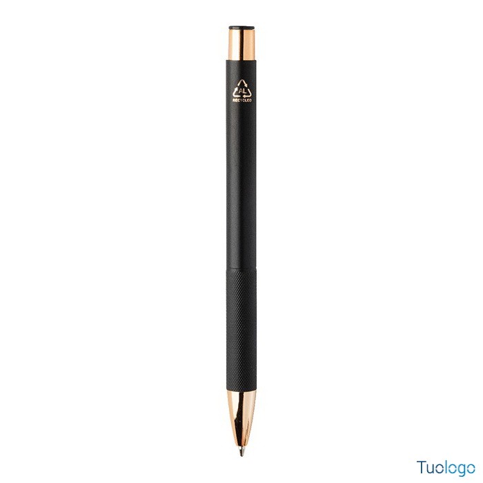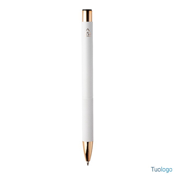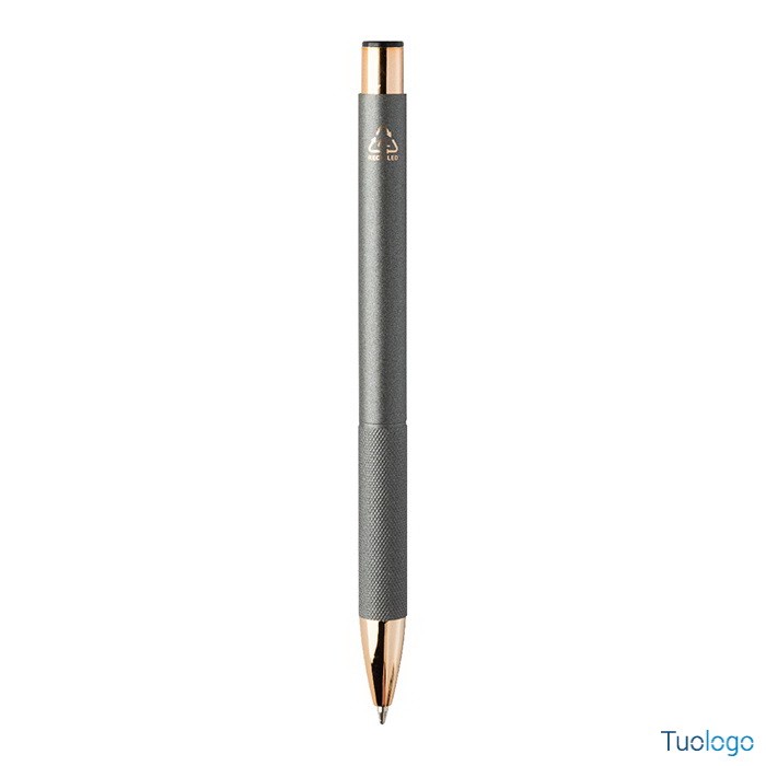 Penna a sfera Praire. Penna a sfera in alluminio riciclato con corpo in finitura opaca, impugnatura testurizzata, dettagli in color oro rosa e refill blu. Dimensioni: cm 1x13,7.
