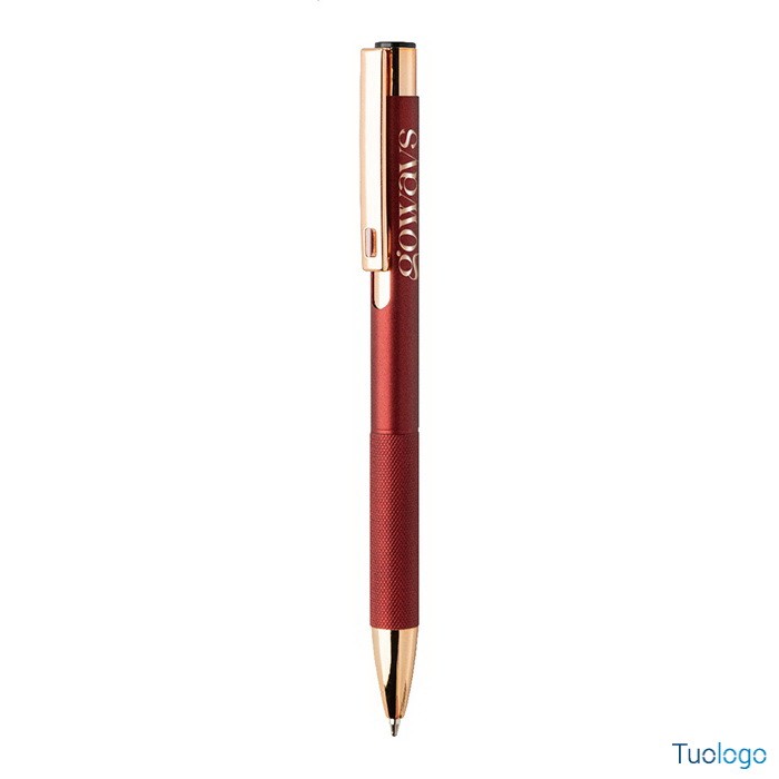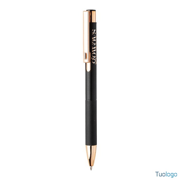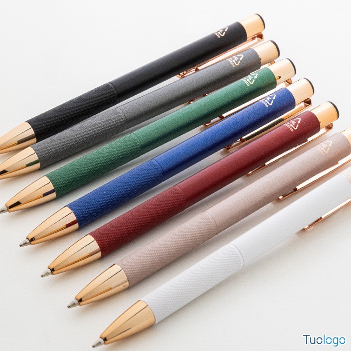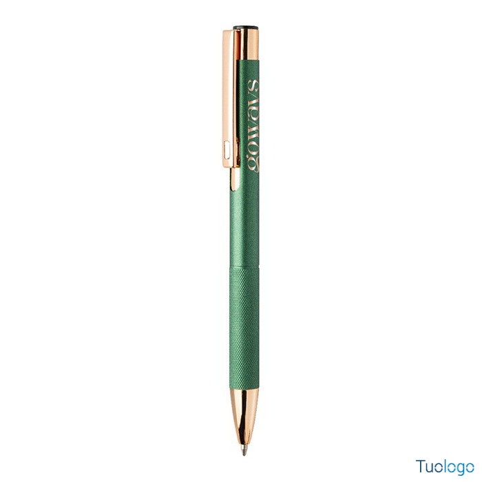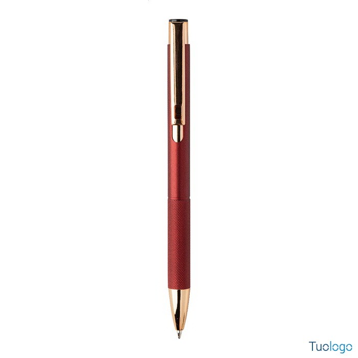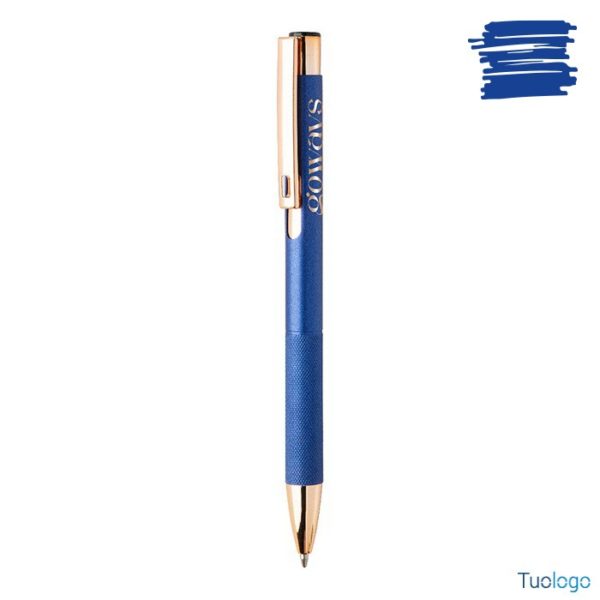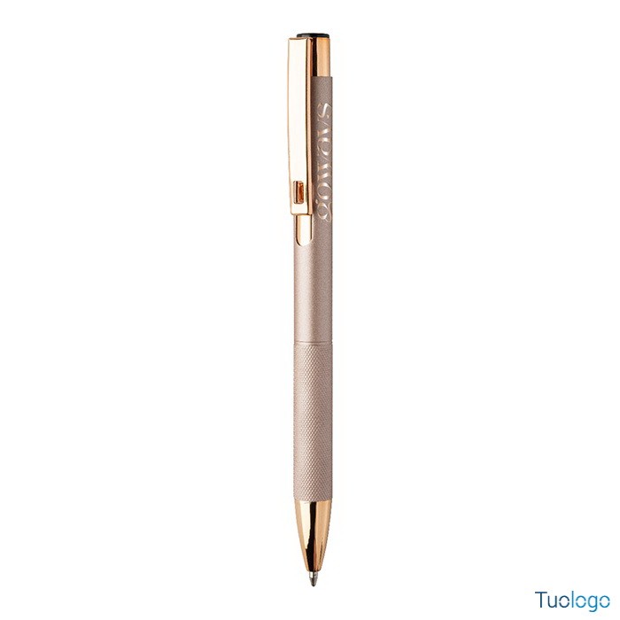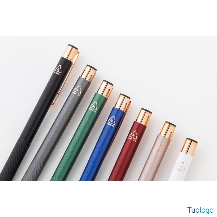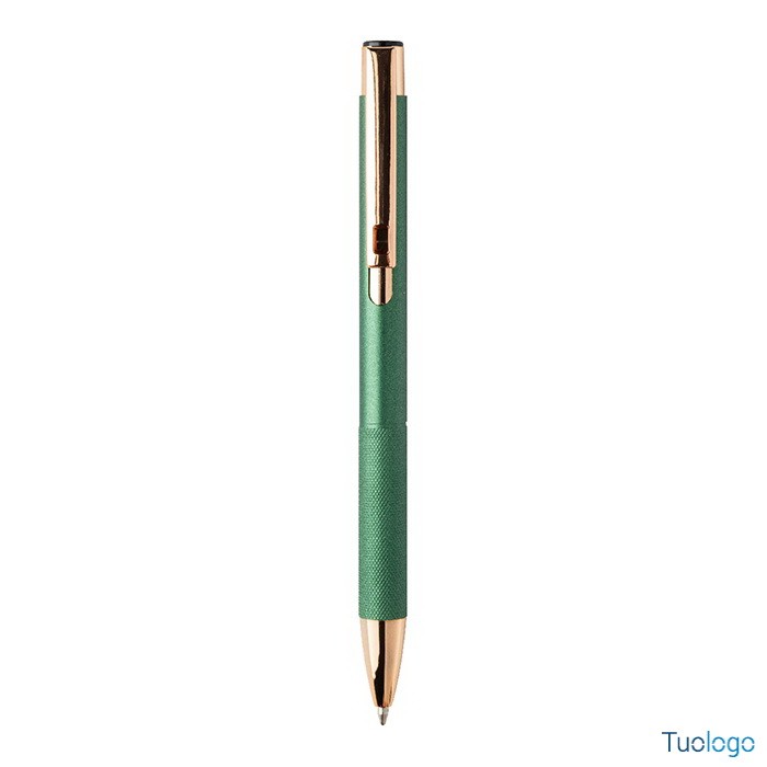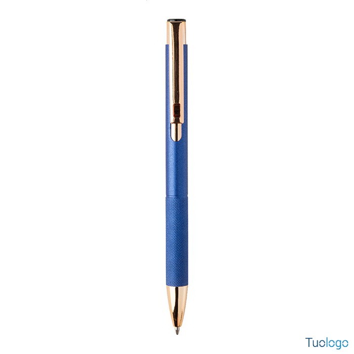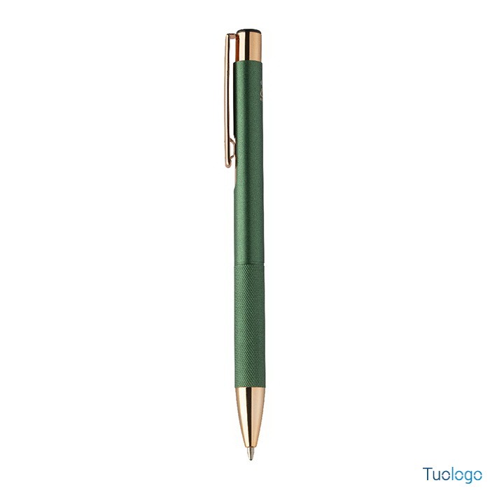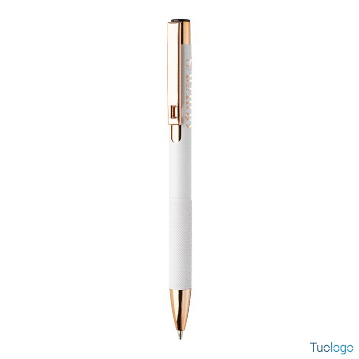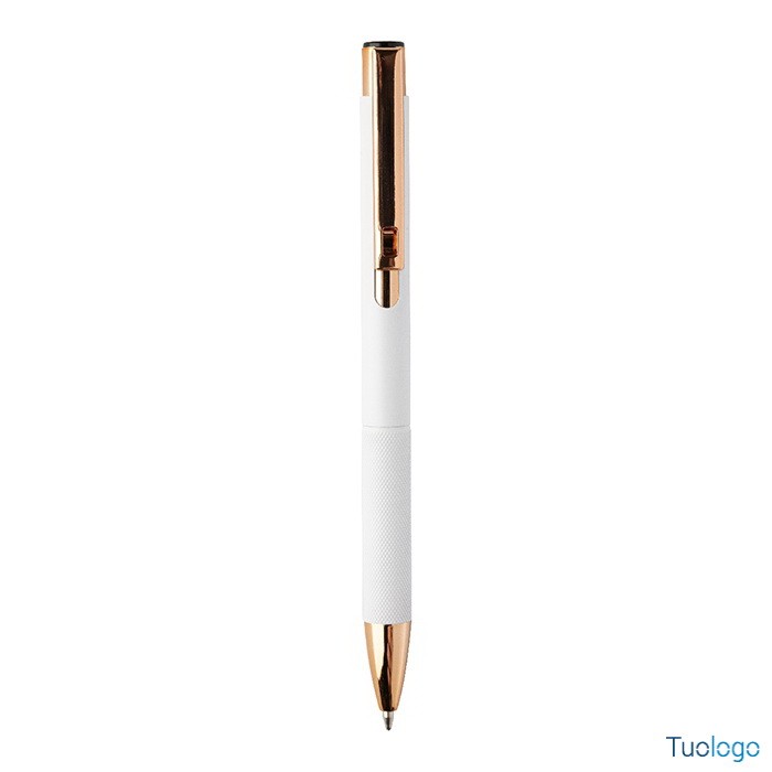 Penna a sfera Praire. Penna a sfera in alluminio riciclato con corpo in finitura opaca, impugnatura testurizzata, dettagli in color oro rosa e refill blu. Dimensioni: cm 1x13,7.