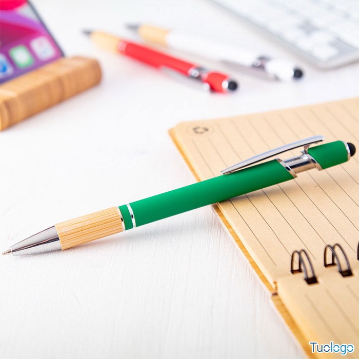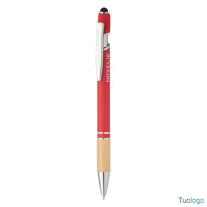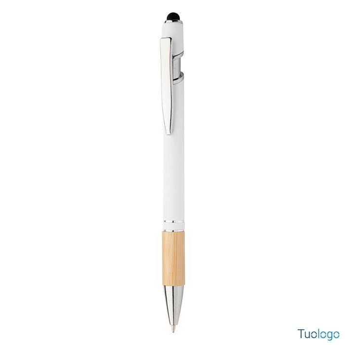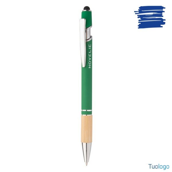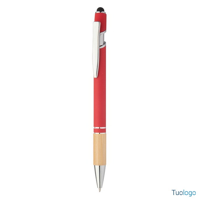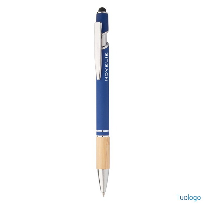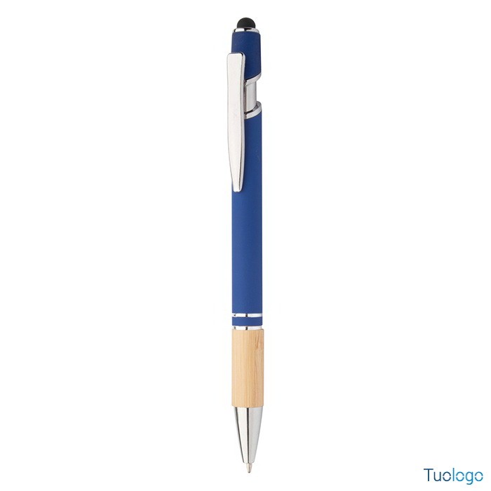 Penna a sfera Ricon. Inchiostro blu. Penna a sfera capacitiva in alluminio con impugnatura in bamboo, finitura gommata e rivestimento speciale per incisione laser a specchio. Dimensioni: diam cm 1×14,2.