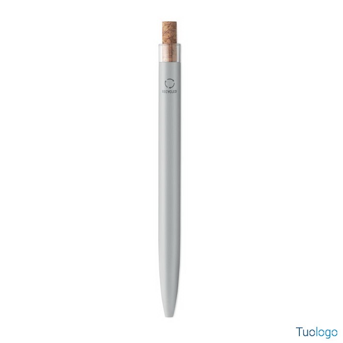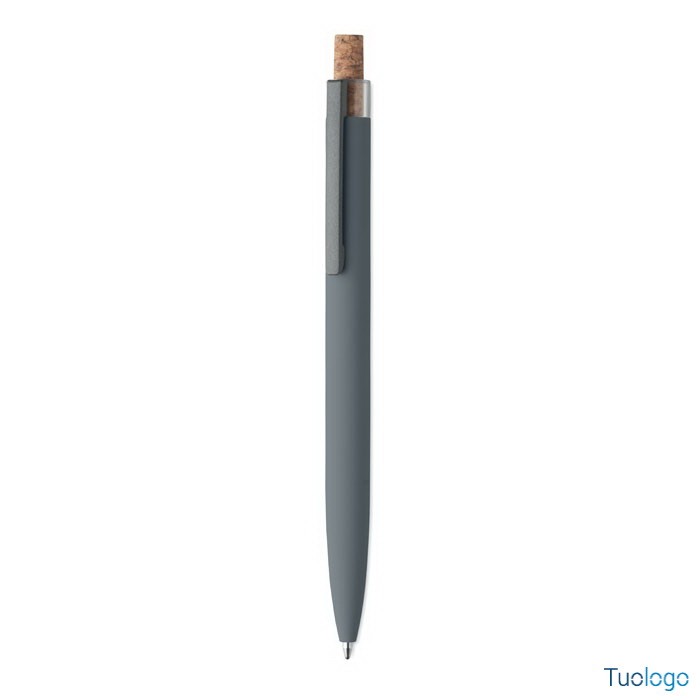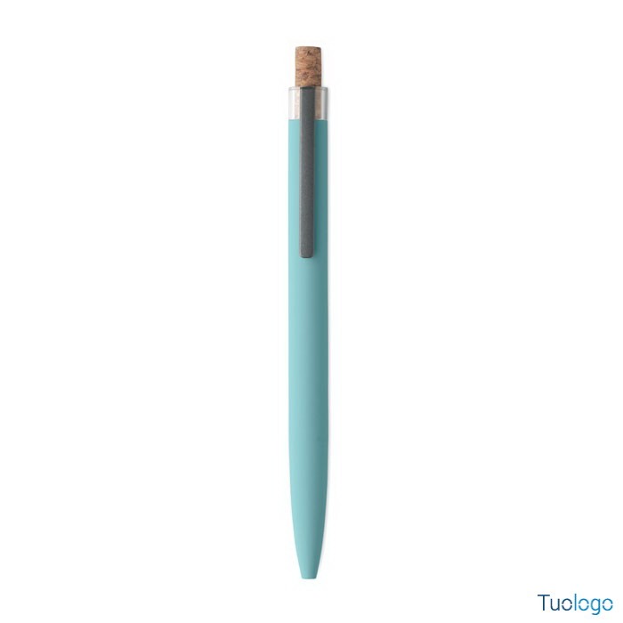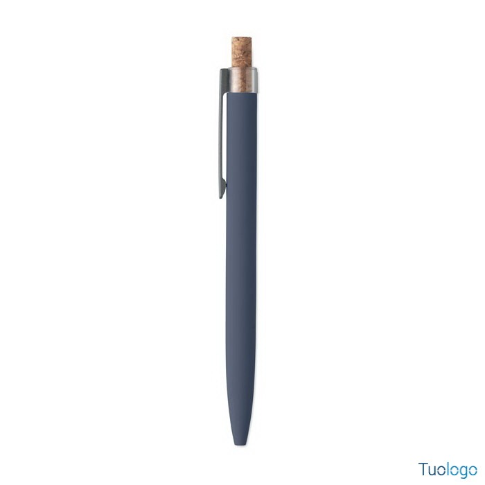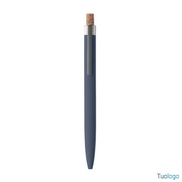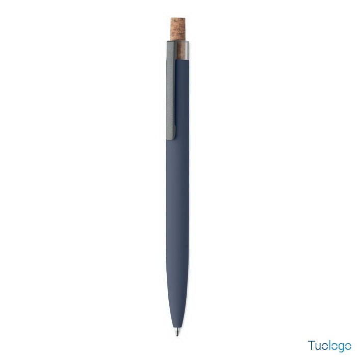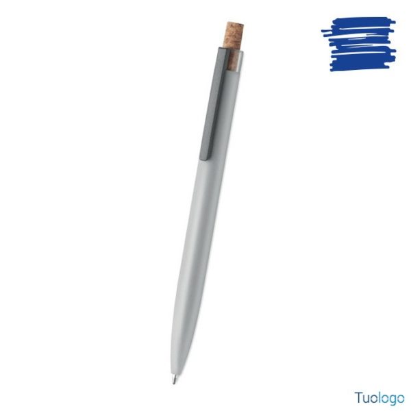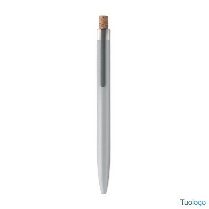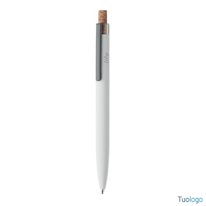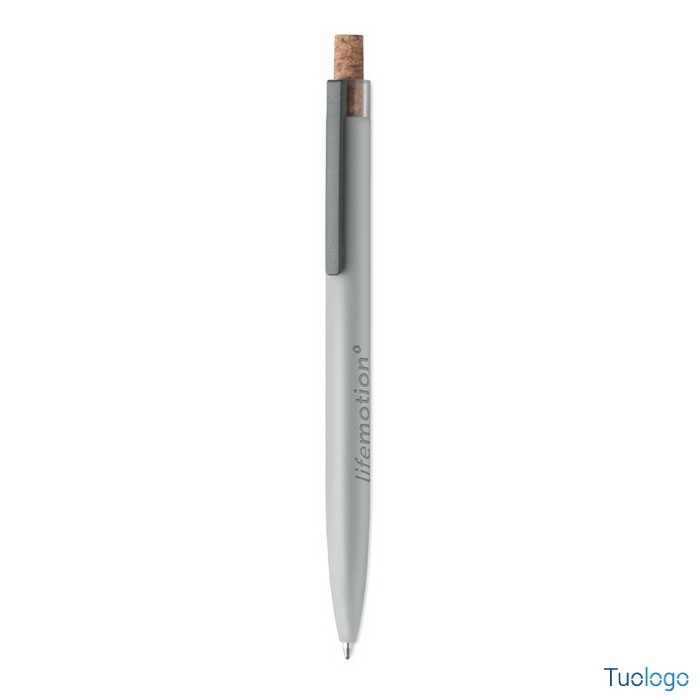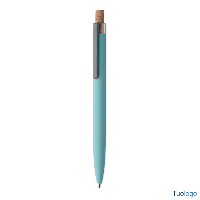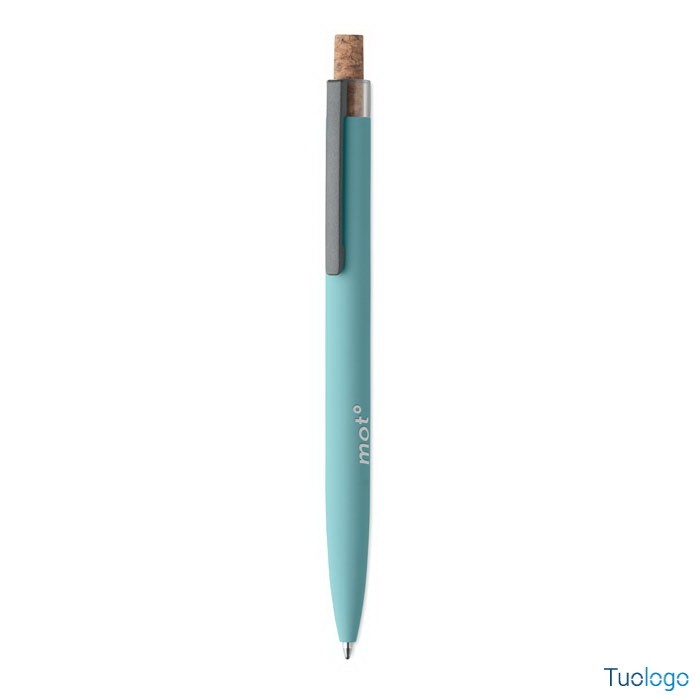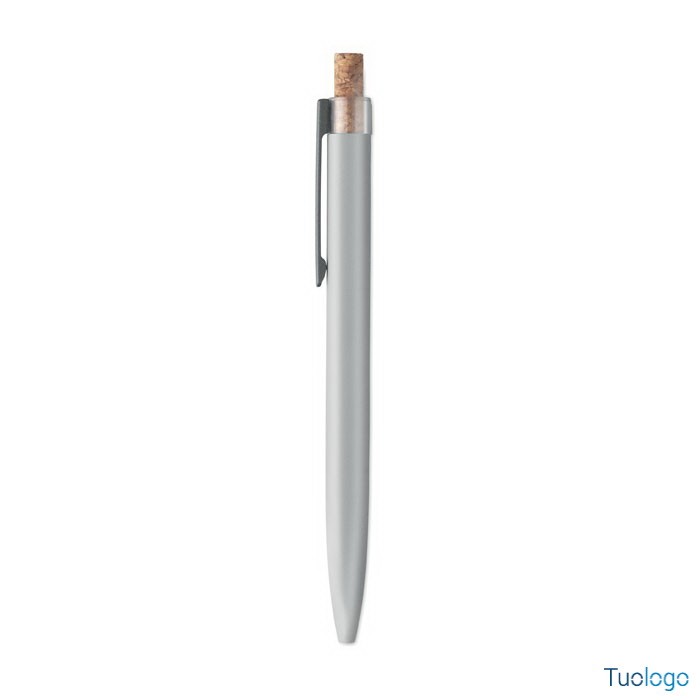 Penna a sfera Soini. Penna a sfera in alluminio riciclato con pulsante in sughero e clip in metallo. Inchiostro blu. Dimensioni: 1x14 cm.