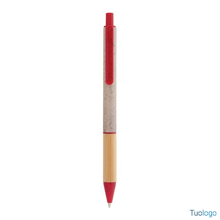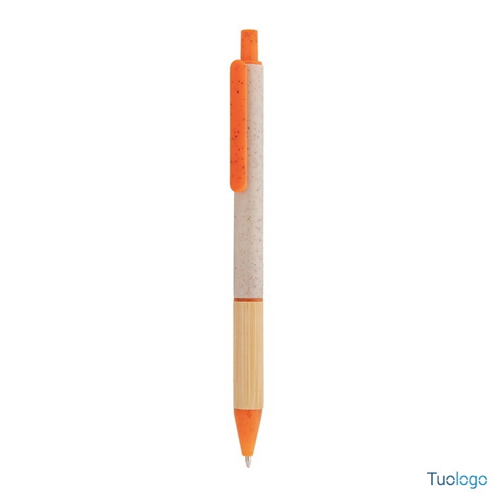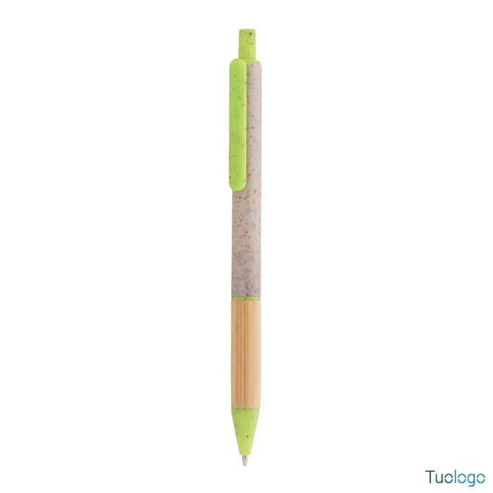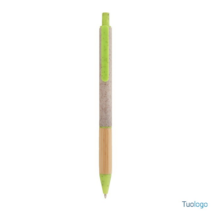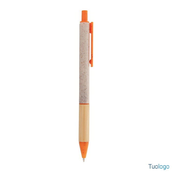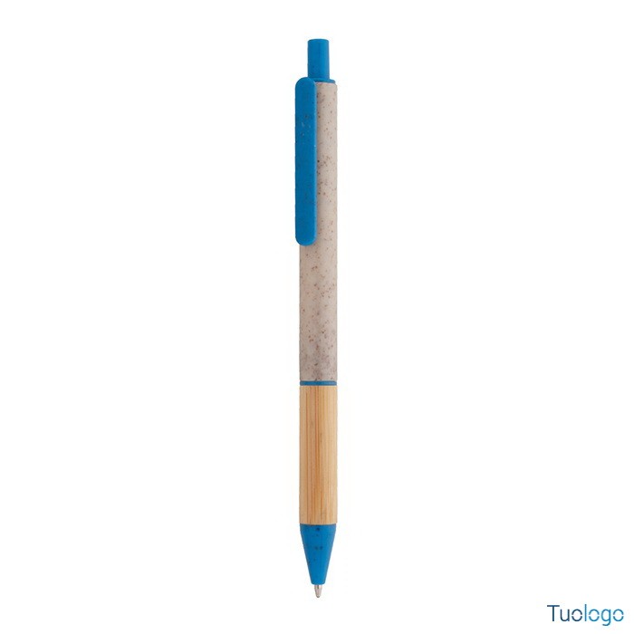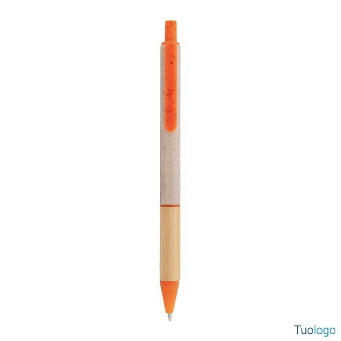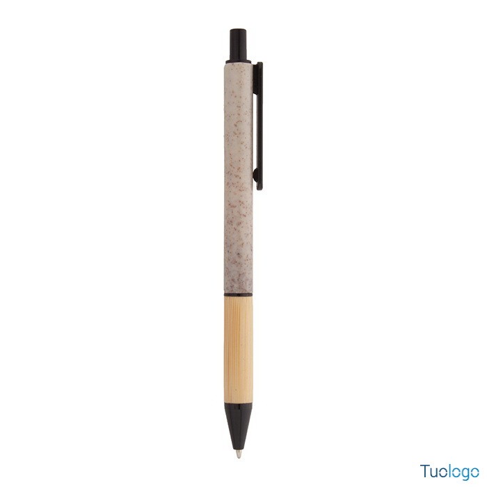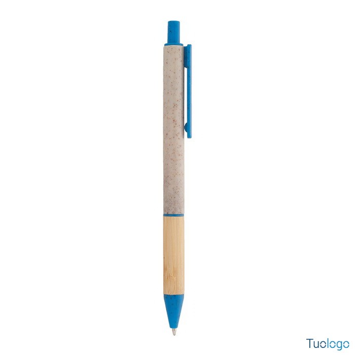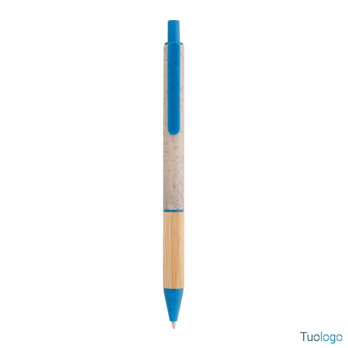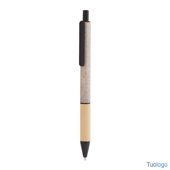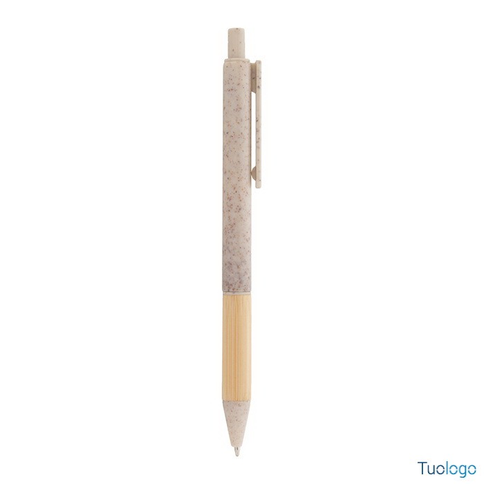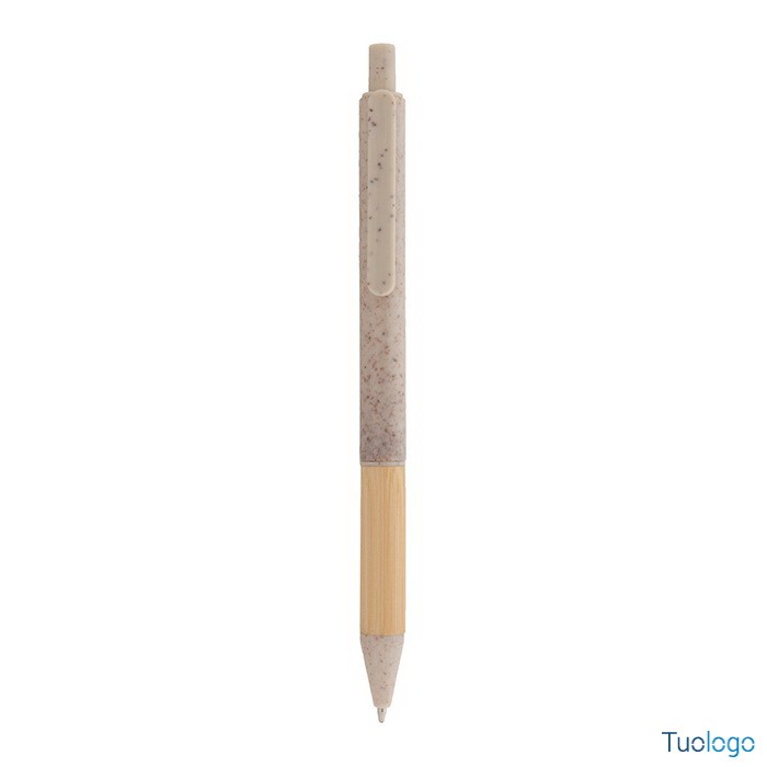 Penna in paglia di grano Bonia. Penna a sfera in plastica ecologica di paglia di grano con impugnatura in bambù e parti in metallo. Con refill blu. Dimensioni: diam cm 0,9x14,2.